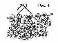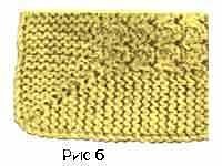 Вывязывают с внутренней стороны детали (рис. 6). По борту связанной полочки и низу изделия набирают петли. Определив центральную петлю угла, с обеих ее сторон по лицу изделия делают прибавление петель, т. е. накиды.