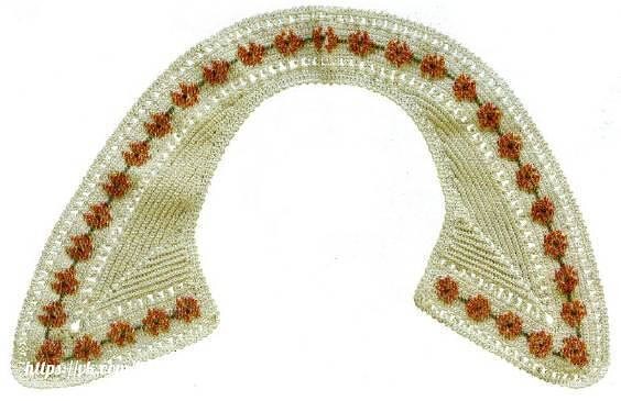 Можно также провязать накиды по рисунку, не скрещивая их. В этом случае угол получается с ажурной полосой. По окончании вывязывания отделочной полосы петли закрывают, не стягивая их.
