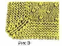 Расчет петель делают сразу на всю отделку изделия: край, планку и углы. Рассчитывают петли по выкройке, на которой отмечают среднюю петлю угла и в каждом .лицевом ряду провязывают по 3 петли вместе(рис 4), по изнаночной стороне изделия вяжут по рисунку.