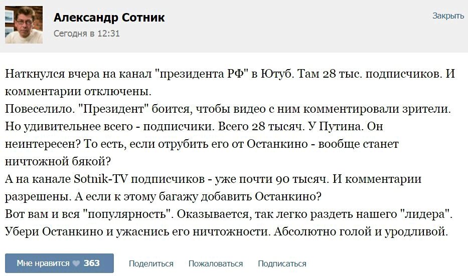Никогда еще страна не погружалась настолько тотально и глубоко в пучину абсолютной мерзости. Вот отпрыск молотовской семейки вещает с трибуны съезда «Единой России» о «любви к родному пепелищу», а вот – министр Мединский утверждает, что «кино без патриотизма – все равно, что ночной горшок ручкой внутрь», а вот – собянинские бульдозеры громят торговые площади по всей Москве, плюя на судебные постановления о праве на собственность. И над всей этой мерзостью возвышается и колосится путинский политический самострой, обсиженный многочисленными чиновниками-мордоворотами и их псами-охранителями, готовыми растерзать любого, кто только помыслит покуситься на эту уродливую незаконную конструкцию, возведенную в обход Конституции и самого здравого смысла.