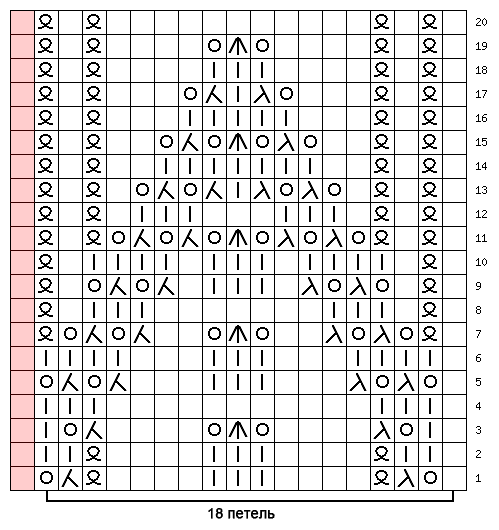 Раппорт узора 18 петель в ширину и 20 рядов в высоту.