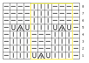 Раппорт узора 6 петель в ширину и 8 в высоту ( раппорт обведен желтым цветом)