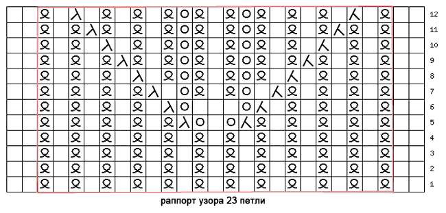 Раппорт узора 23 петели в ширину и 12 рядов в высоту.