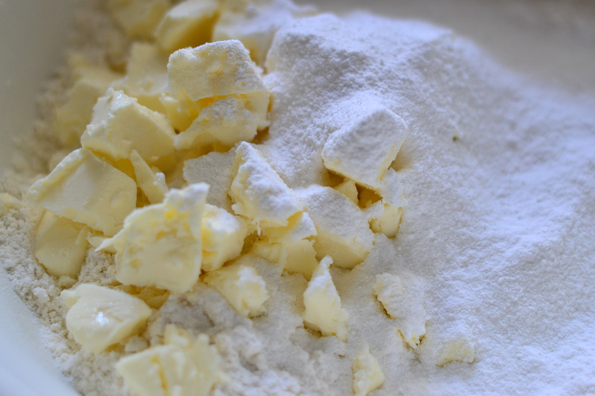 Включить духовку на температуру 190 гр. Просеять муку,добавить разрыхлитель,соль,сливочное масло,порезанное на кубики ,сахарную пудру и перемешать до состояния крошки.
