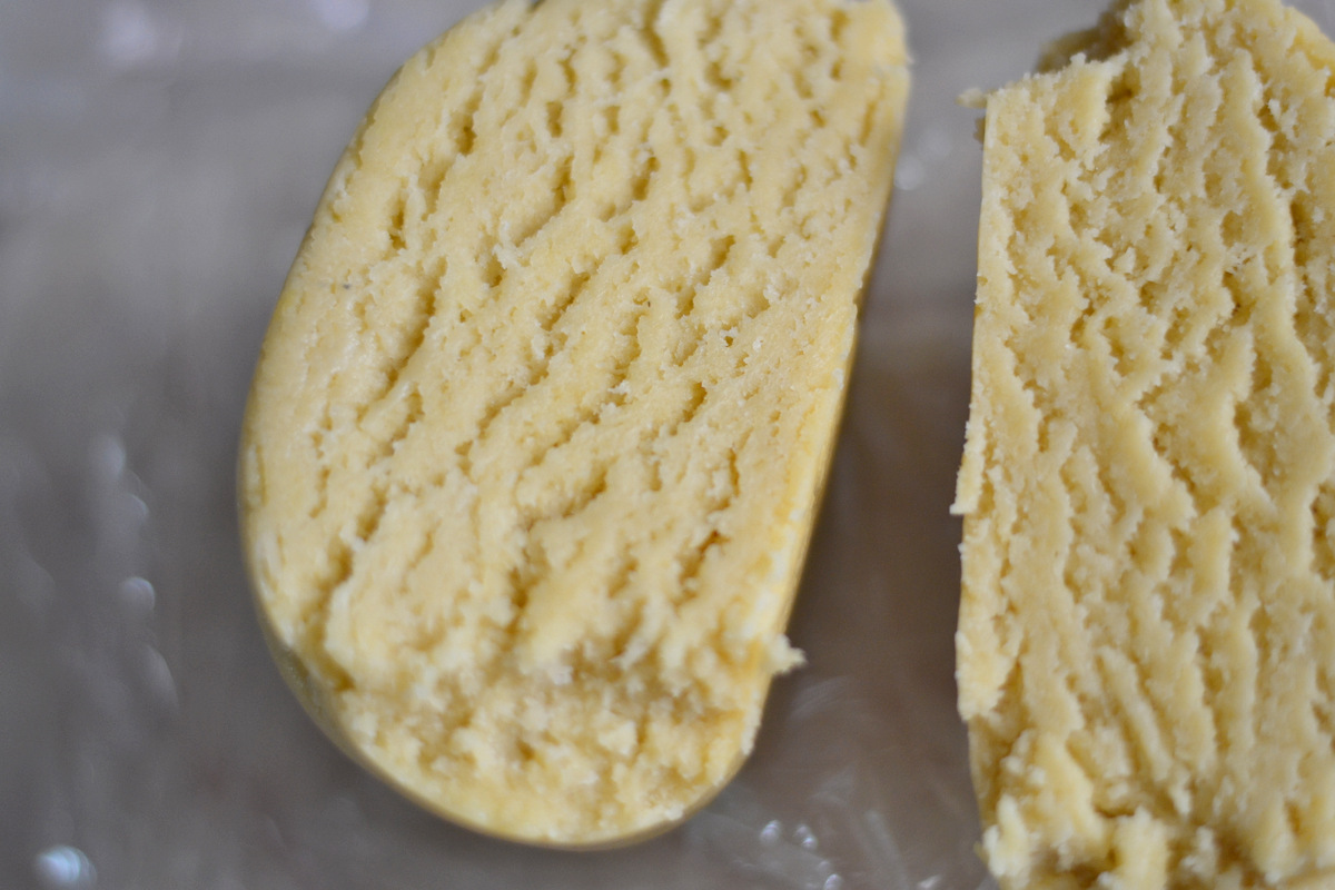 Достать тесто и разрезать его на 2 части,одна из которых должна быть немного больше другой.