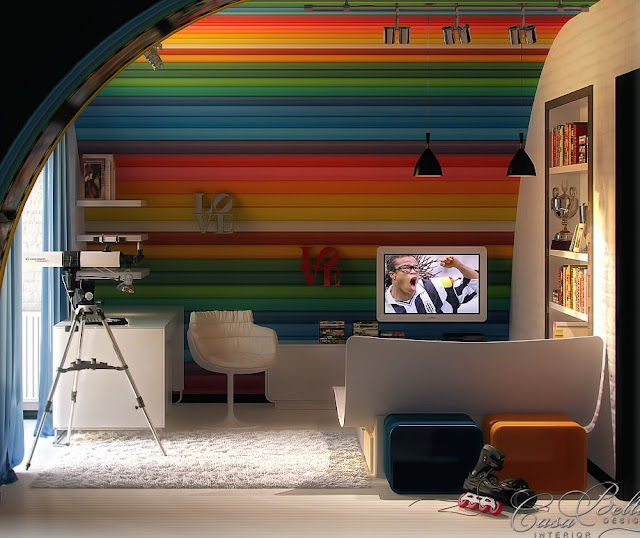 Чаще всего в таком стиле оформляются детские и игровые комнаты,но иногда и компьютерные кабинеты,уголки для просмотра ТВ,мастерские художников и студии музыкантов и дизайнеров, творческих работников.