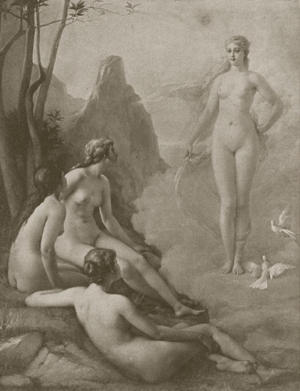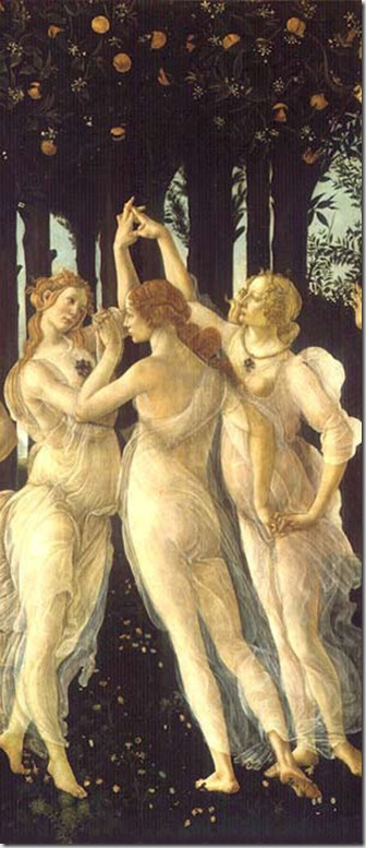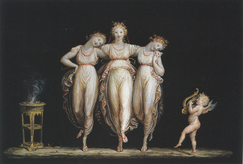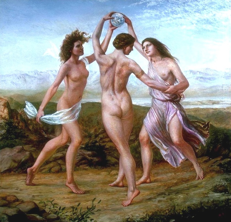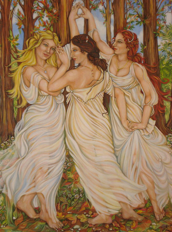 В греко-римской мифологии три грации (в греческом варианте – хариты) – это сестры Аглая, Талия и Эфросина, дочери Зевса (Юпитера) и Эвриномы (дочери Океана).