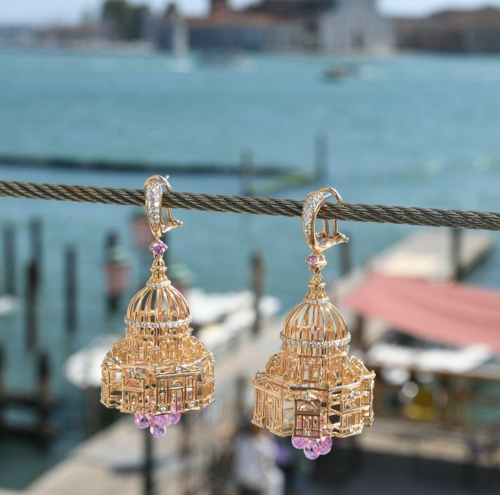 Серьги Basilica della Salute Nardi из желтого и белого золота, розовых и синих сапфиров Он очень переживает за свой красивый и романтичный город. Его пугают бесконечный поток туристов и все более частые и большие приливы. Один из них уничтожил почти все бумажные архивы фирмы в 1960-е годы.