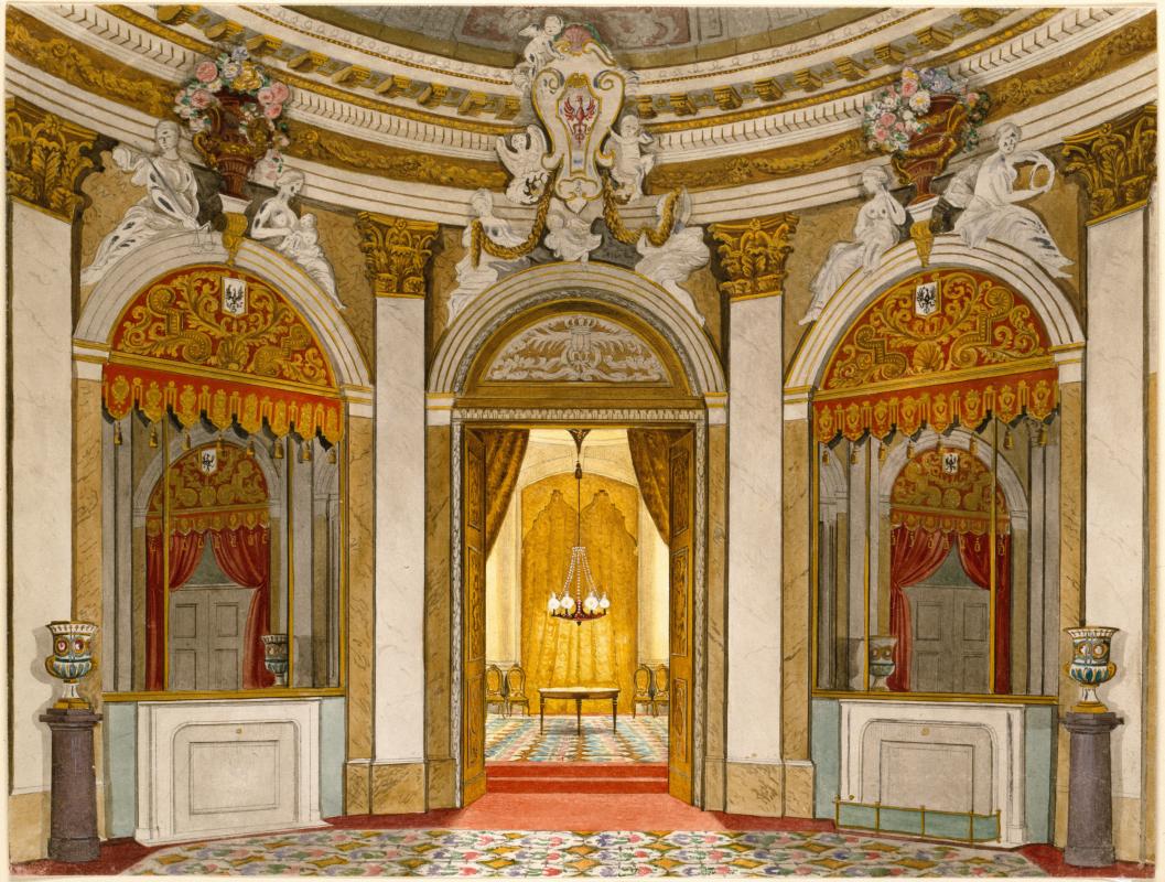 — поначалу служил репрезентативным целям, но по мере наполнения его мебелью уже в правление Фридриха Вильгельма IV выполнял функции салона.