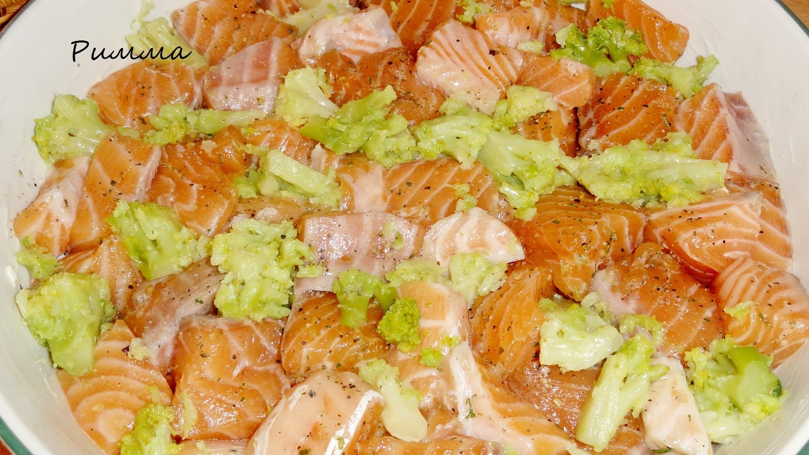 В смазанную маслом форму сначала выложите рыбу, брокколи и розмарин.