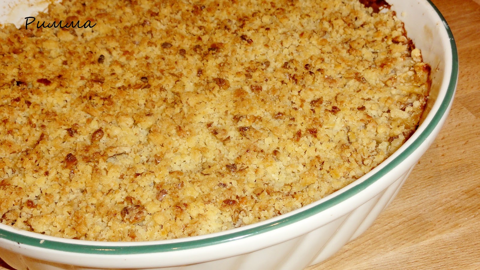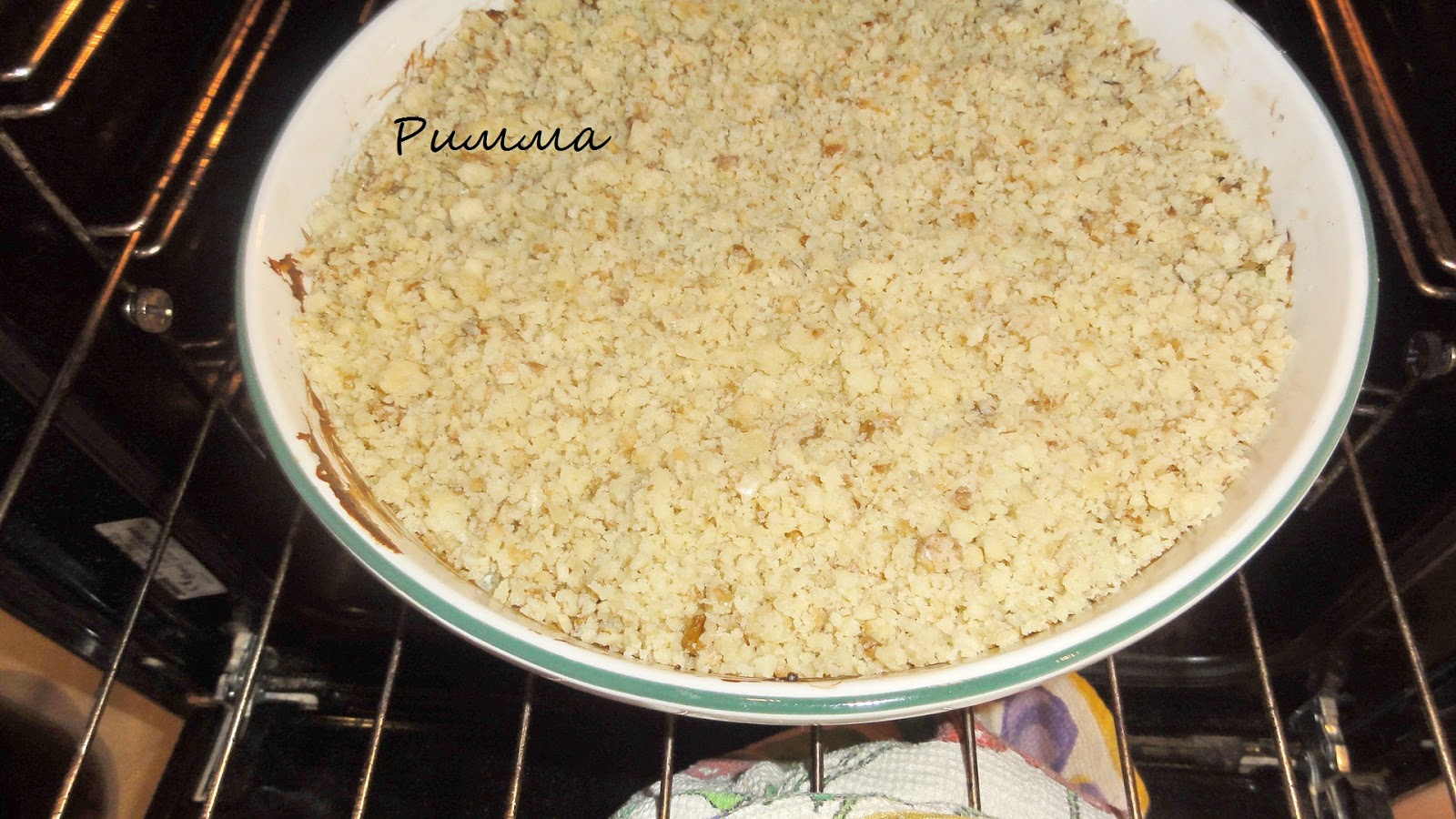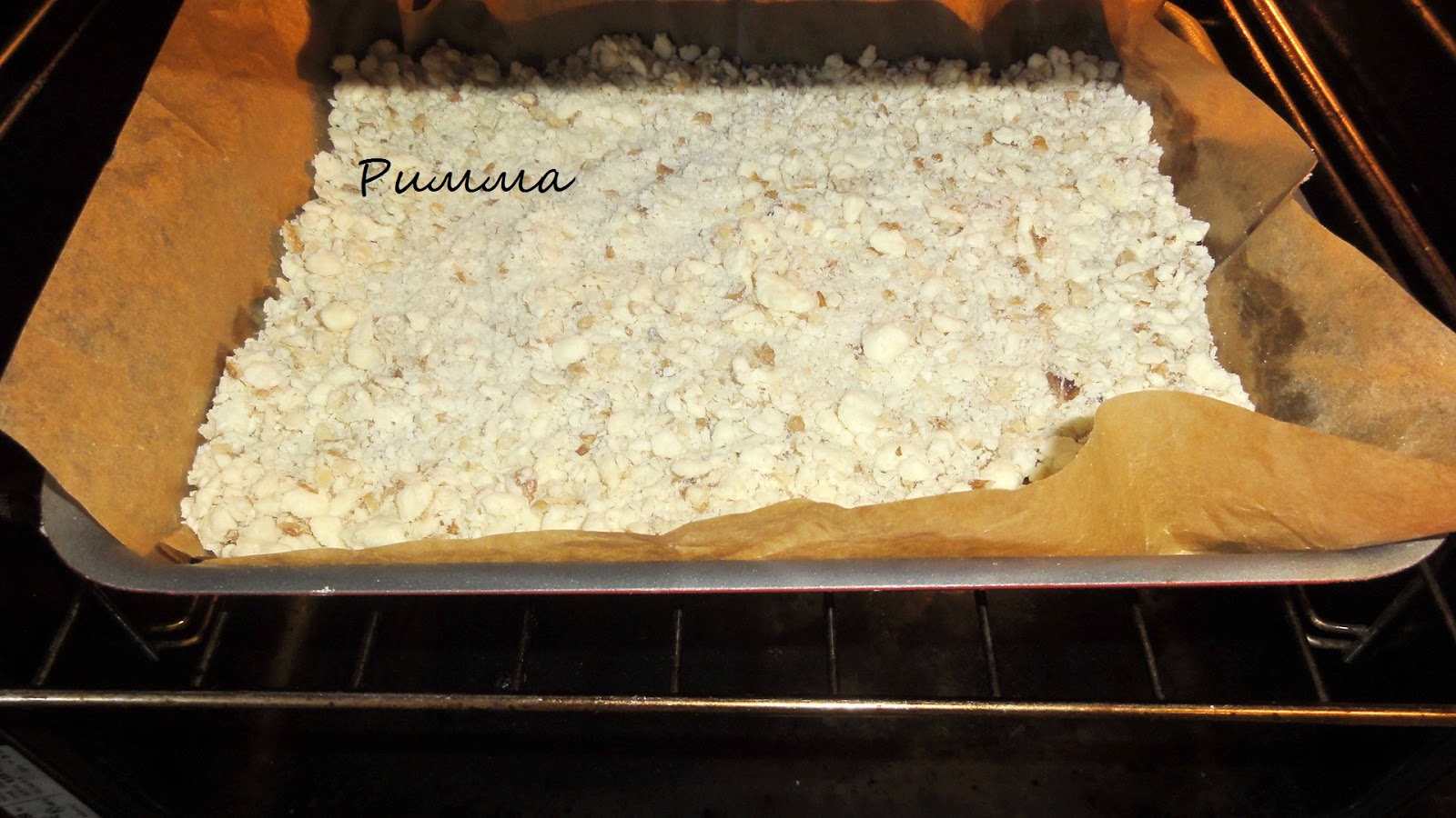 Противень или форму застелите бумагой, выложите на нее крошку и поставьте подрумянится в разогретую до 200 градусов духовку на 10-15 минут. Крошка должны иметь золотистый цвет.