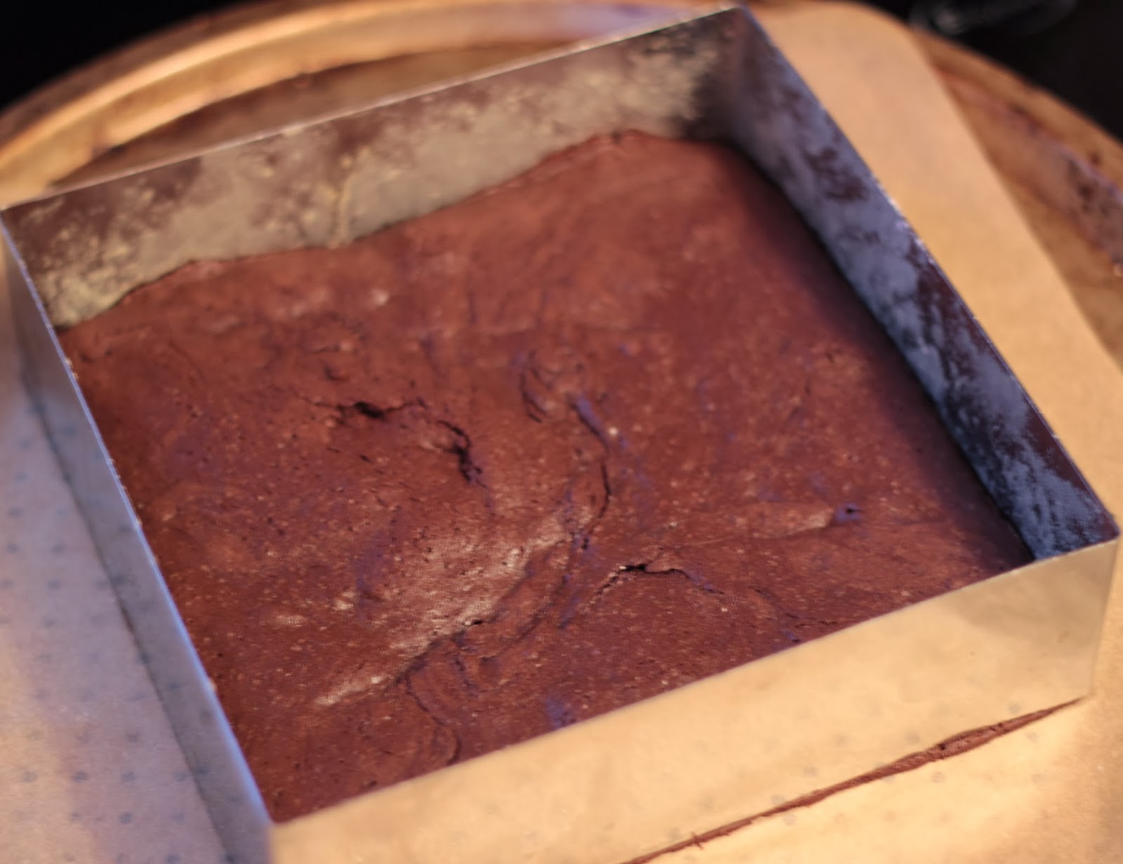 Готовый корж должен казаться недопеченным (так написано в книге, по-моему, чем-то похоже на брауни). Достать его из формы и остудить на решетке. Форму помыть, обсушить и застелить пластиковой пленкой. В идеале - жесткой ацетатной пленкой, которой у меня, к сожалению пока нет, я взяла обычную пищевую пленку. Остывший корж вернуть в форму.