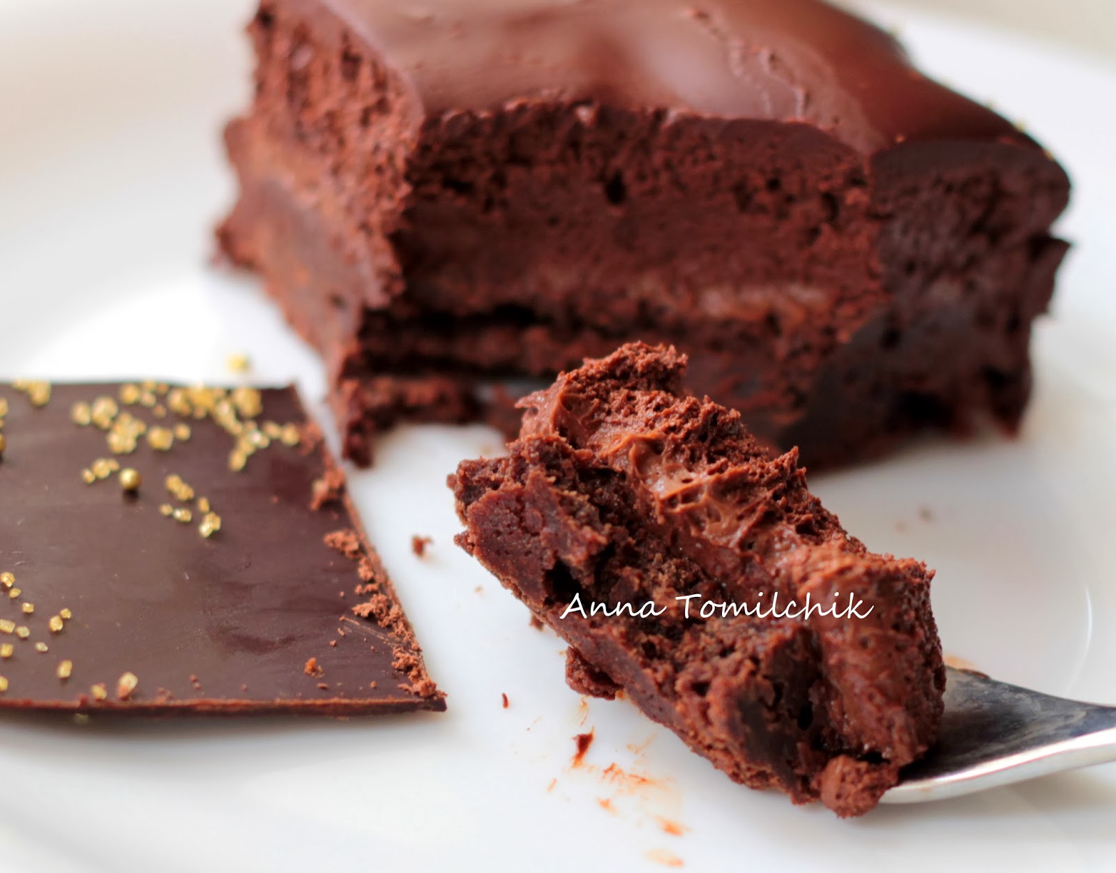 Интересно, есть ли люди, которые не любят шоколад?.. Я думаю, таких все же меньшинство. Не могу назвать себя заядлым шокоголиком, но жизнь без шоколада я представить не могу. Люблю и горький, и молочный, и белый, ем по настроению. И конечно, разные виды шоколада используются в составе тортов и других десертов, гармонируя с остальными ингредиентами. Недавно я решила попробовать рецепт абсолютно шоколадного торта, который, собственно говоря, так и называется - Carrément Chocolate (в переводе с французского - абсолютный шоколад). Автором рецепта является Пьер Эрме. Получилось какое-то шоколадное безумие! Оно и неудивительно - шоколадная основа, шоколадный крем, шоколадный мусс, шоколадная глазурь и тонкий лист из горького шоколада. 5 разных текстур, и все с насыщенным шоколадным вкусом. Больше не буду рассказывать про этот торт, лучше приведу его рецепт, чтобы вы сами приготовили и все поняли.