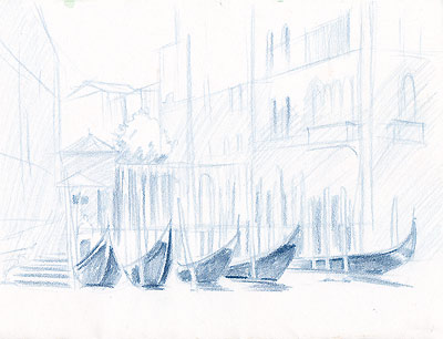 За основу я взяла свою фотографию, сделанную в Венеции. Здесь меня привлек сложный ритм вертикальных линий. Скорее, это образ для работы маслом, а не для акварели. Но я взяла именно этот сюжет, чтобы показать, как просто сделать такую сложную детальную картину карандашами.