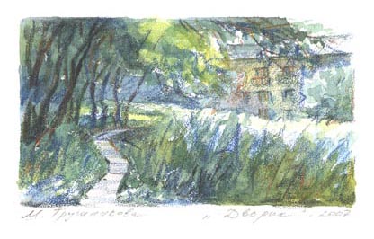 2. Далее я накладываю штриховку синим на теневые части объектов пейзажа. Очень легкую - на светлые детали, темнее - на темные. В этой стадии лучше сделать светлее, чем нужно, дабы не переборщить. После размывания исправлений уже не внесешь.