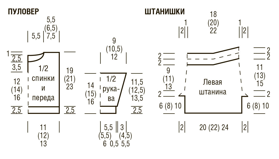 Для боковых убавок в середине штанин в каждом 8 (10) 12-м круг.р. 4 раза убавить по 1 п. = 104 (112) 124 п.