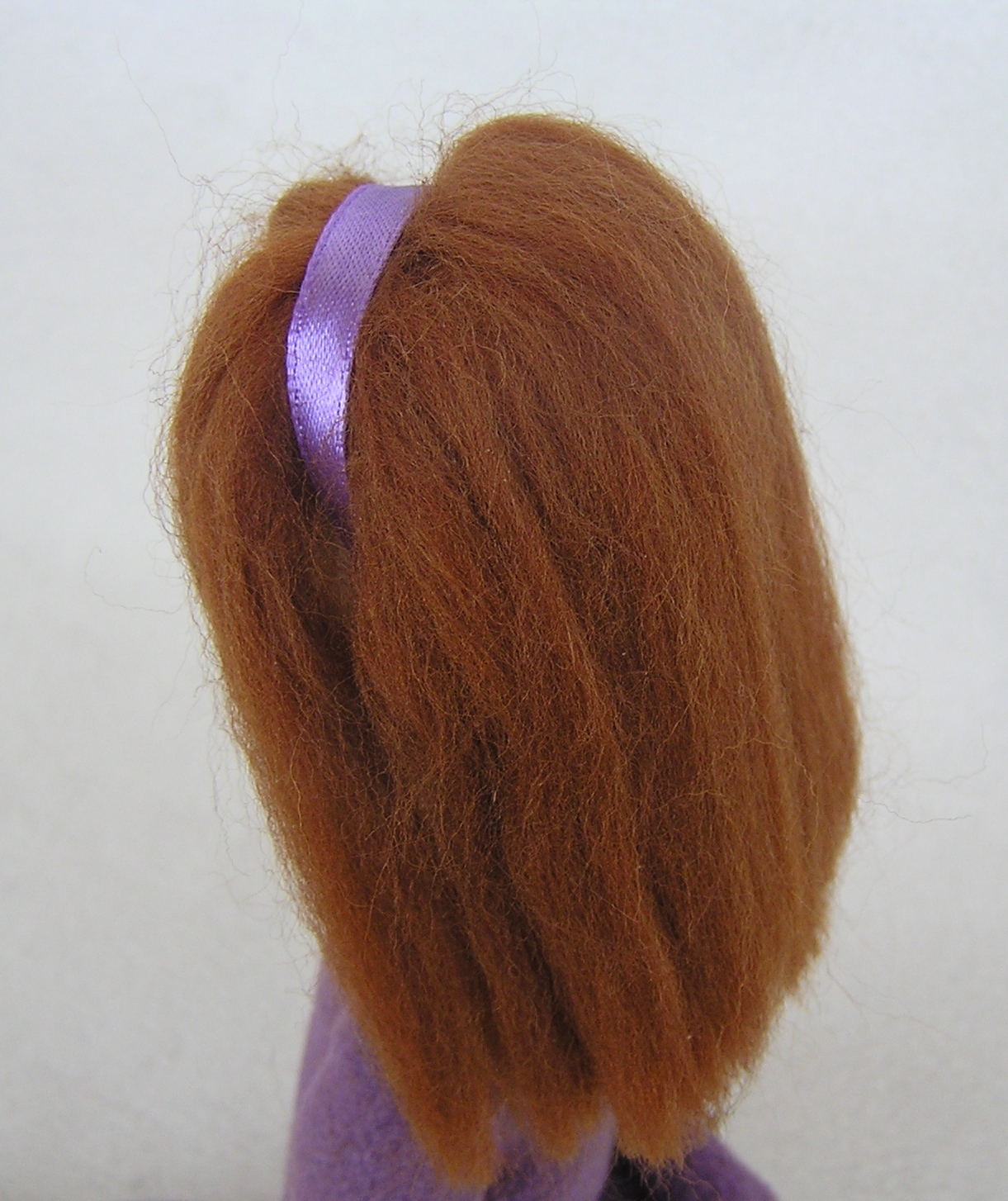 Отмеряем длину волос и длину линии пришивания. Вырезаем из бумаги полосу нужной длины. Раскладываем волосы на бумажной полосе. Прошиваем посередине на машинке, бумагу аккуратно отрываем. Волосы готовы. Волосы будут пришиваться по верхнему шву головы. Длина линии пришивании 5 см.