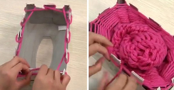 Еще один способ нестандартного применения картонных коробок! Если бы я раньше знала, что можно вязать таким образом… Теперь меня ничто не остановит, осталось лишь прикупить ниток побольше.