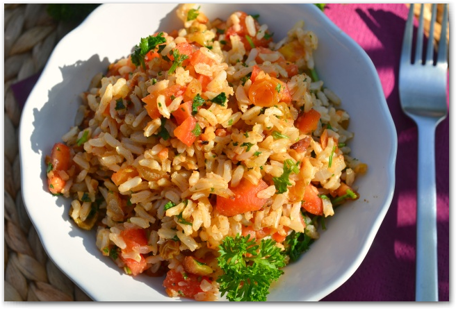 11. Всё! Великолепный гарнир готов. Вкус получается очень богатый и разнообразный. С этим блюдом можно так же бесконечно импровизировать, добавляя или убавляя те или иные продукты. Готовила этот рис уже несколько раз, я в полном восторге, поэтому решила поделиться рецептом с вами. Надеюсь, у вас тоже приживётся столь необычный гарнир из риса.