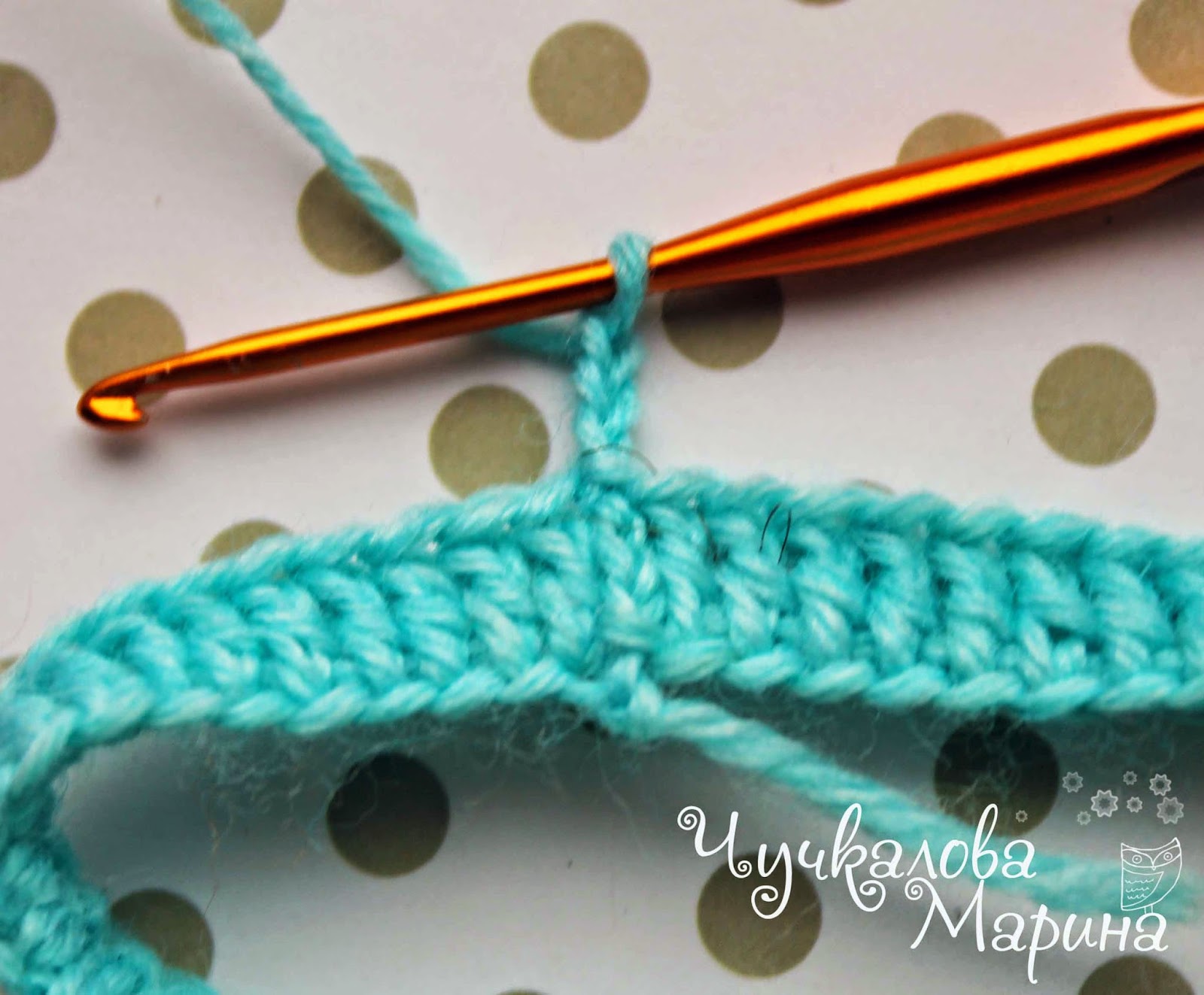 После того как свяжете второе ухо, не отрывая нити продолжайте вязание: