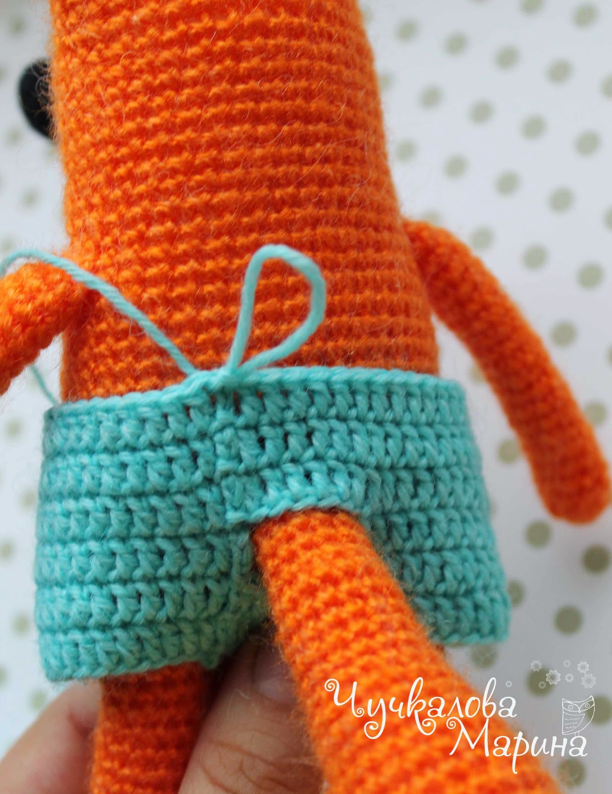 Важно! Петли ножек мы не стягиваем, потому что будут еще ступни. Их мы свяжем отдельно. Просто оставьте нить для пришивания ступней.
