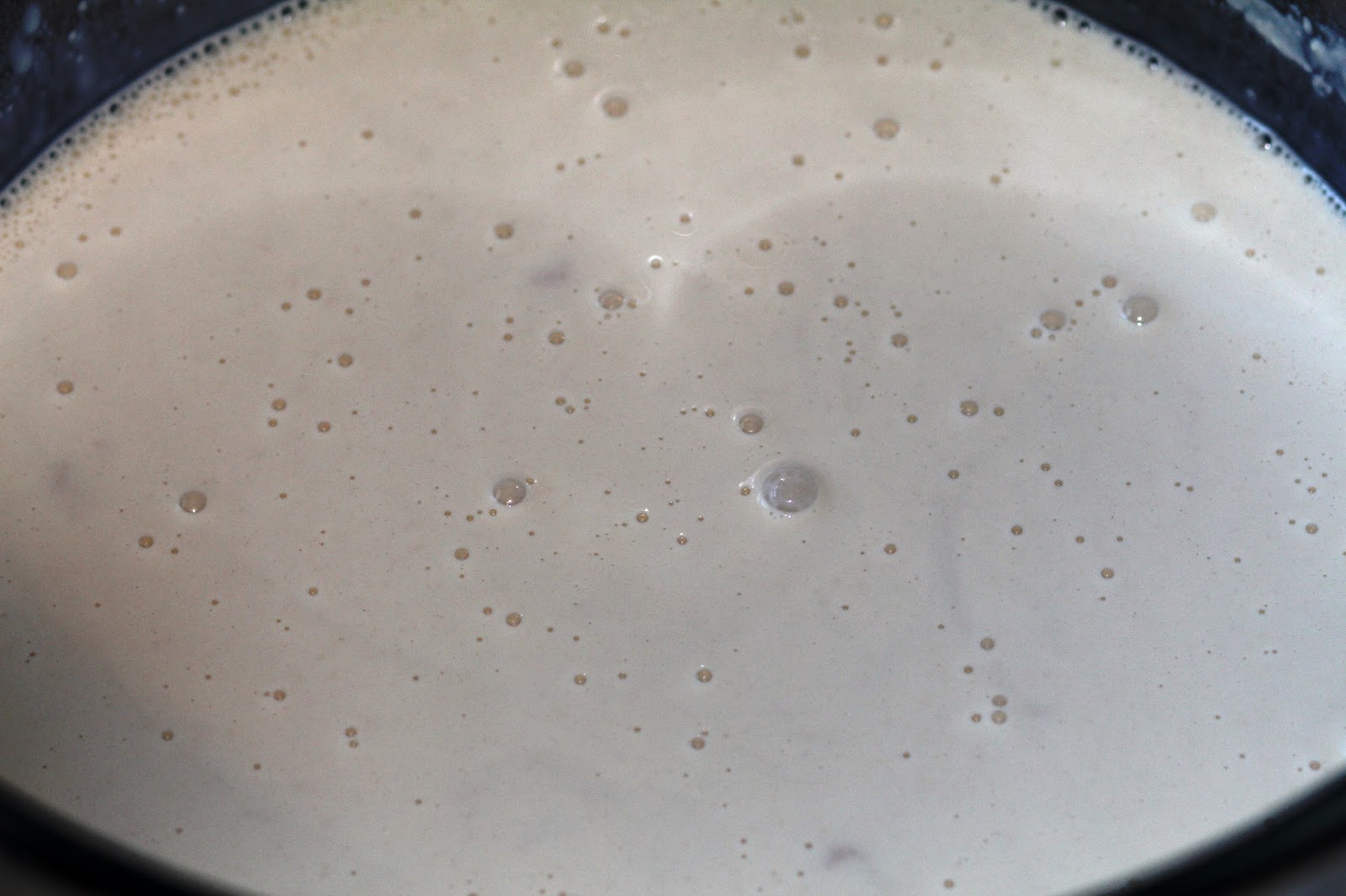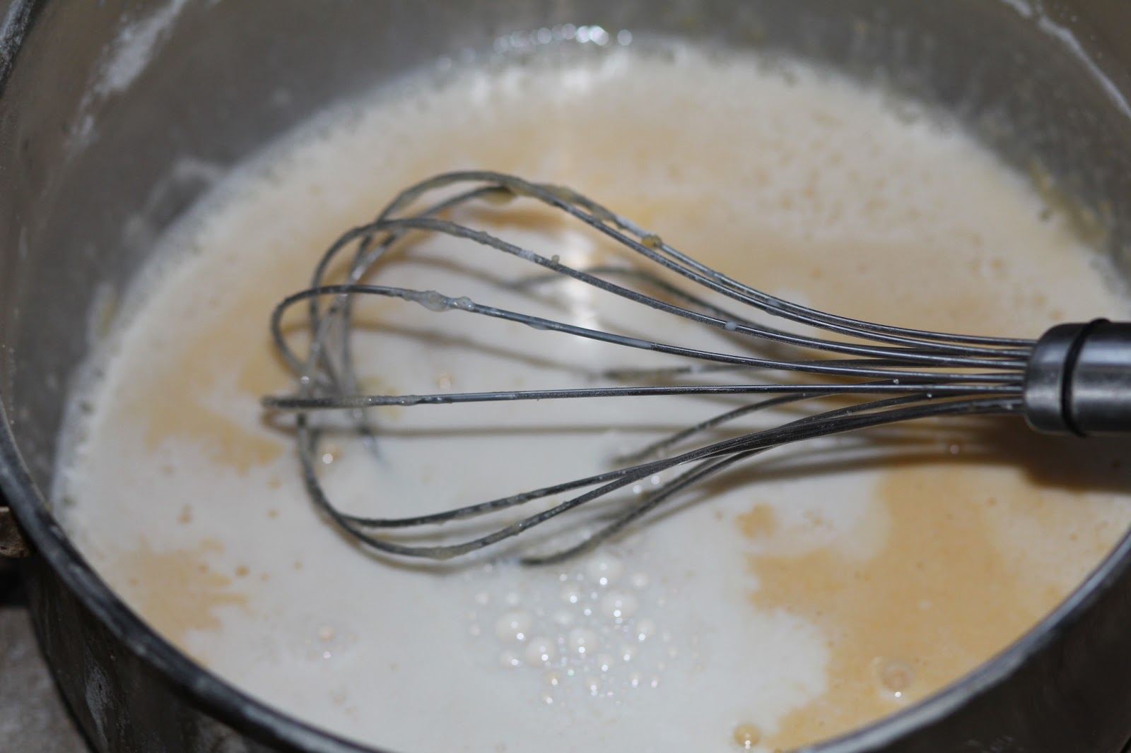 13. В крахмально-яичную смесь, очень осторожно, тонкой струйкой в несколько приемов влить молоко, каждый раз хорошо размешивая., чтобы не образовывались комочки (я мешаю венчиком).