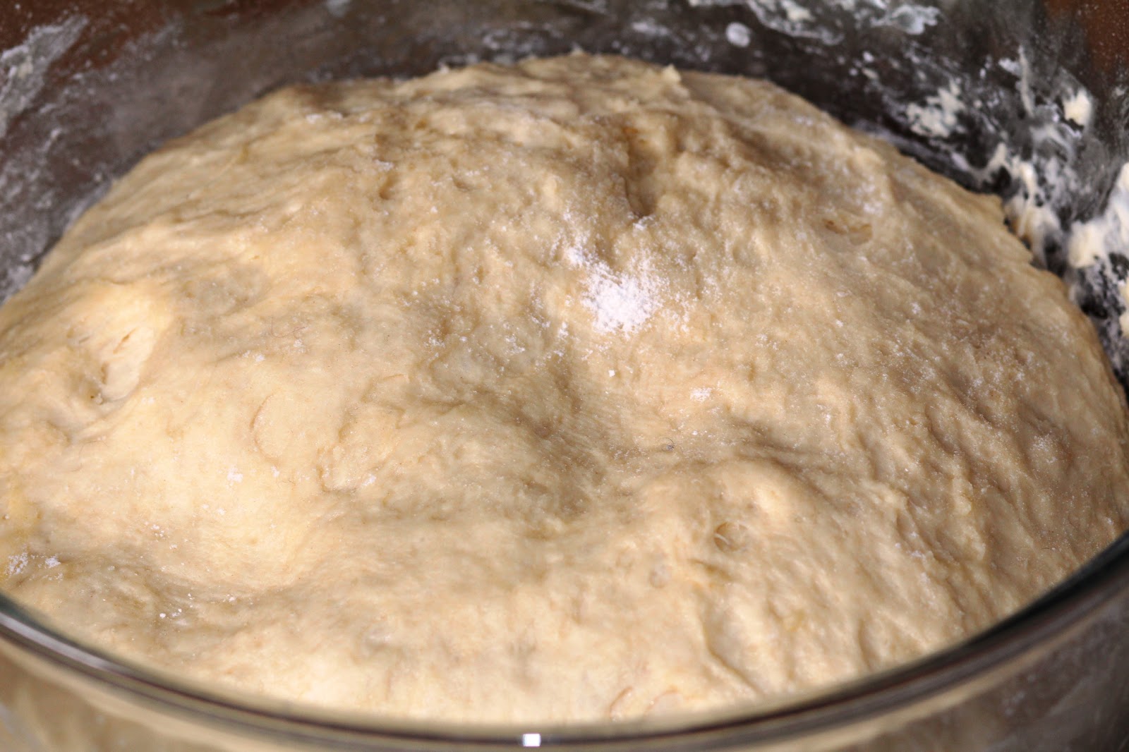 8. Руки смазать растительным маслом и замесить тесто. Тесто вымешивать до тех пор пока оно не перестанет липнуть к рукам. Сформировать из теста шар, положить тесто в слегка обсыпанную мукой миску. Накрыть миску с тестом полотенцем и поставить в теплое место на 1 - 1.5 часа.