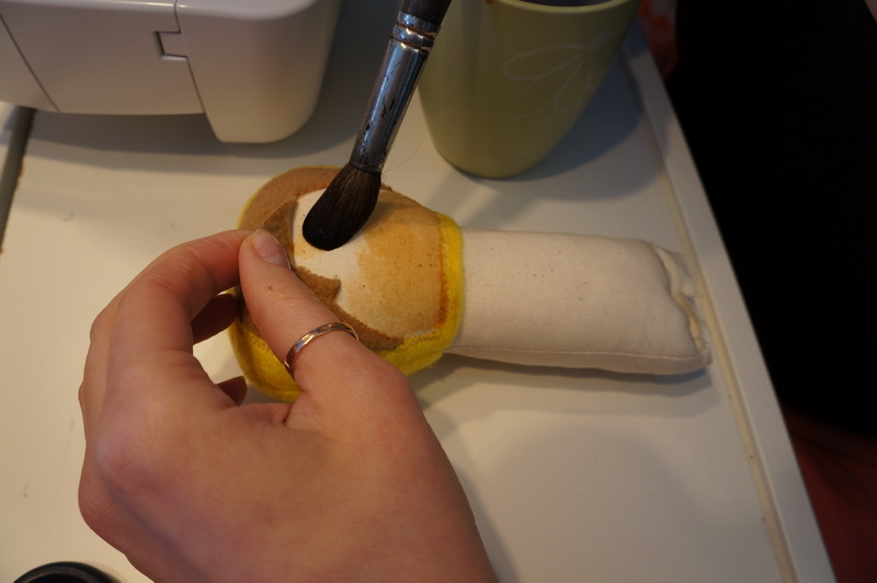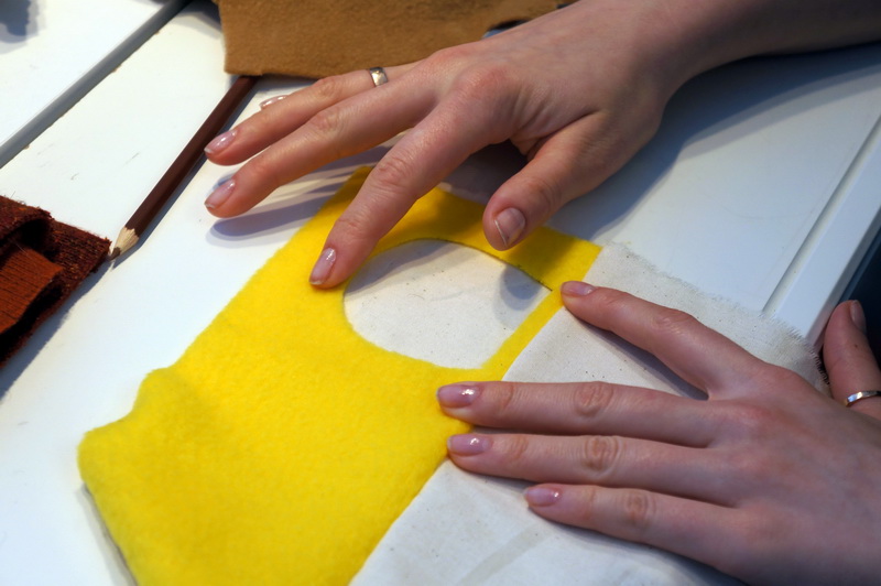 Подбираем направление ткани для основной головы. Я выбрала желтую. У меня будет весенняя девочка. Если вы хотите вытянутую в стороны голову, то выкройки будут распологаться вдоль тянущейся стороны, если вытянутую вверх, то вдоль не тянущейся стороны.