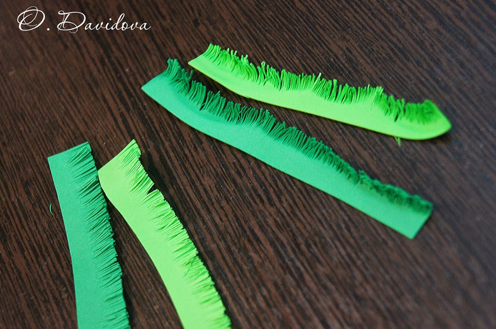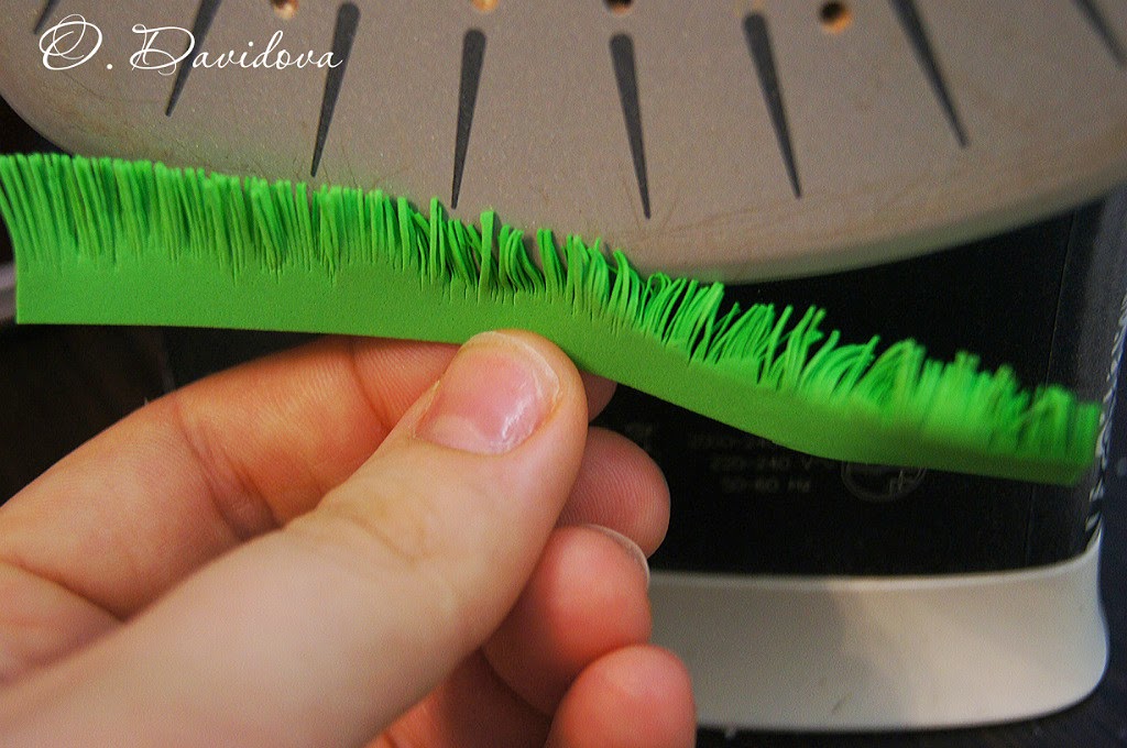 две полоски зеленого фома разных оттенков, квадрат из фома, нитки, синтепон и и иголка!