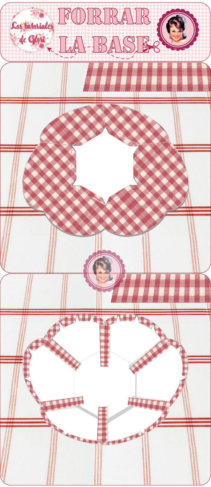 Procedemos a forrar la base, de la forma que indica la imagen, no os olvidéis darle piquetes a los bordes de la tela antes de pegar. Приступить, чтобы выровнять основание, так, как показано на рисунке, не забудьте дать укусов края холста до связи.