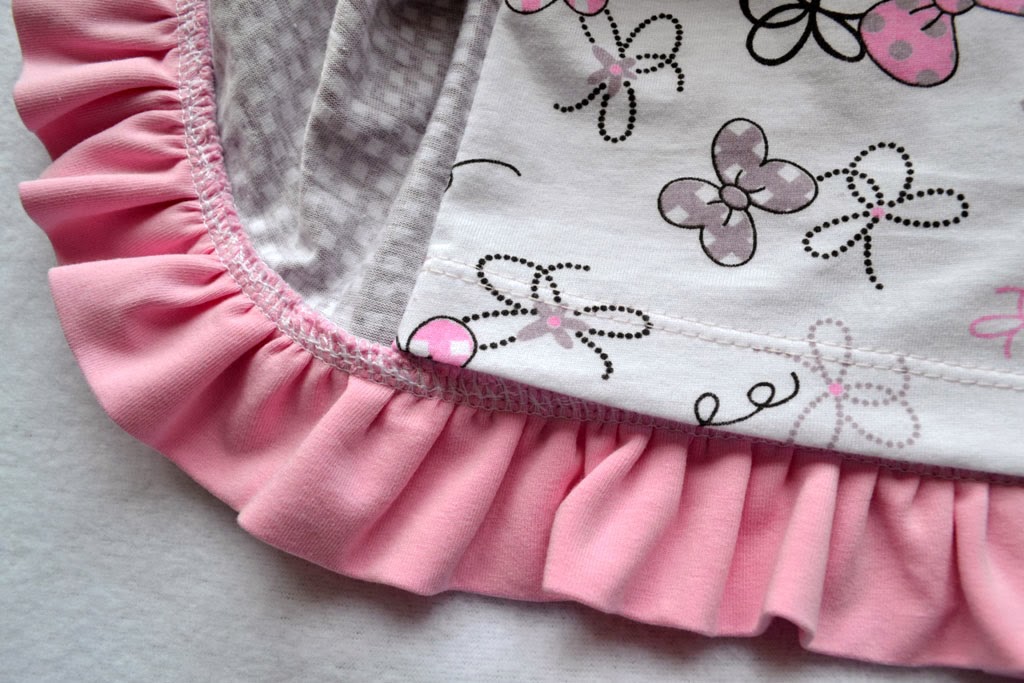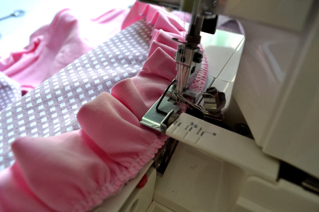 Волан собрала на оверлоке, выставив соответствующие настройки длины стежка и дифференциала. Пришлось оба среза проходить по отдельности, потому что оверлок с тканью в два слоя делал маленький коэффициент сборки, да и таким способом воланчик получился пышнее.