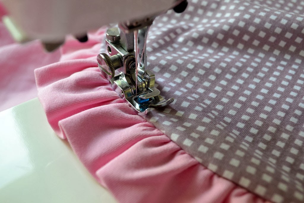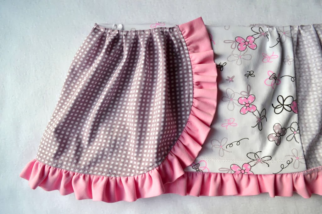 Прикалываю/ приметываю волан к нижнему срезу верхней юбочки, пришиваю на оверлоке.