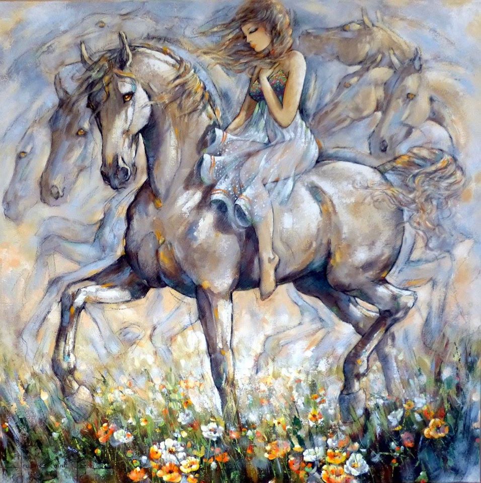 Источник её вдохновения кроется исключительно в мире лошадей, очаровывая художницу, одновременно, неукротимой мощью и изысканной элегантностью животного.