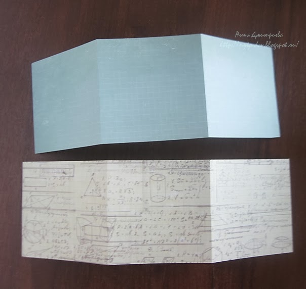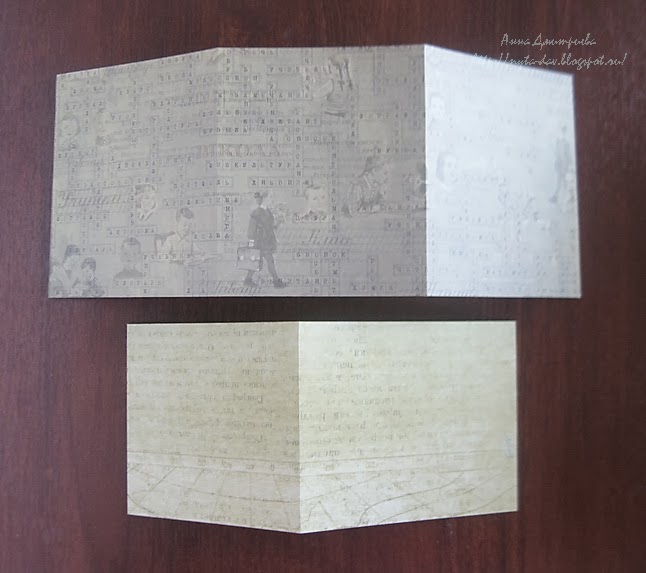 Для прямоугольника из скрапбумаги понадобилась одна полоса шириной 12 см и длиной 30 см и одна полоса шириной 10 см и длиной 22 см со сгибом. Также делаем сгибы, прикладывая саму заготовку: