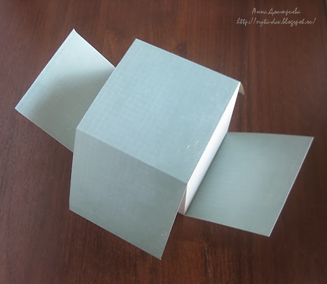 Затем сверху и снизу приклеила крышечки - квадраты со сторонами 10х10 см. Итого получился вот такой кубик (справа):
