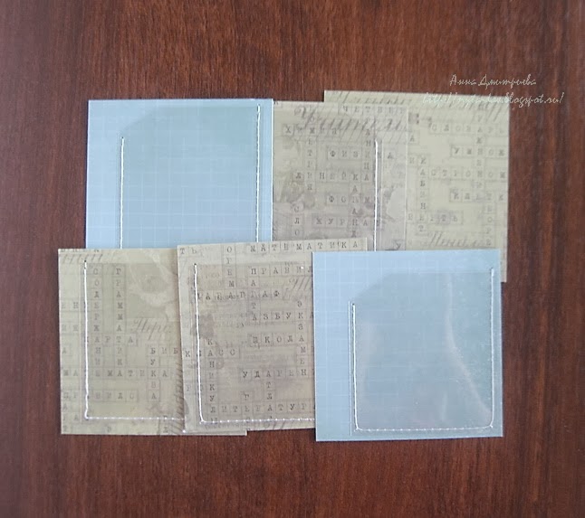 Скрапбумагу я не стала приклевать сразу, а сначала задекорировала. Вырезала 6 квадратиков поменьше (7х7 см) и 5 прямоугольников 6х5,5 см из плотной пленки, срезала уголки у прямоугольников. Пленку пришила на машинке к квадратикам: