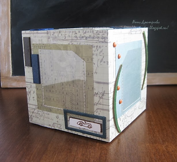 Приклеила эти квадратики и декор на полоски скрапбумаги. Важно! декор на гранях кубика старалась располагать симметрично, чтобы потом кубик ровно стоял. Вставила также брадсы и только после этого приклеила полоски к картонной заготовке: