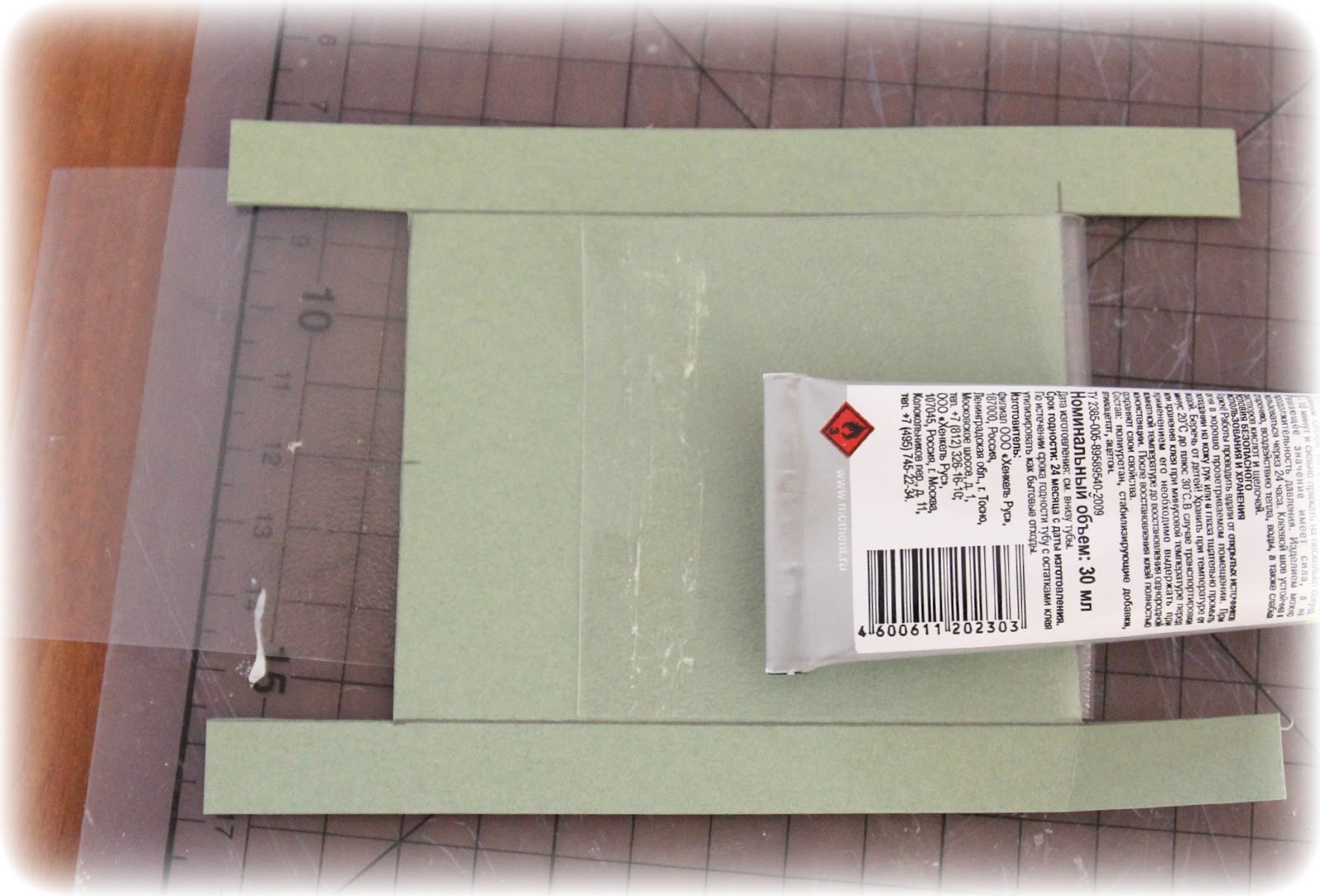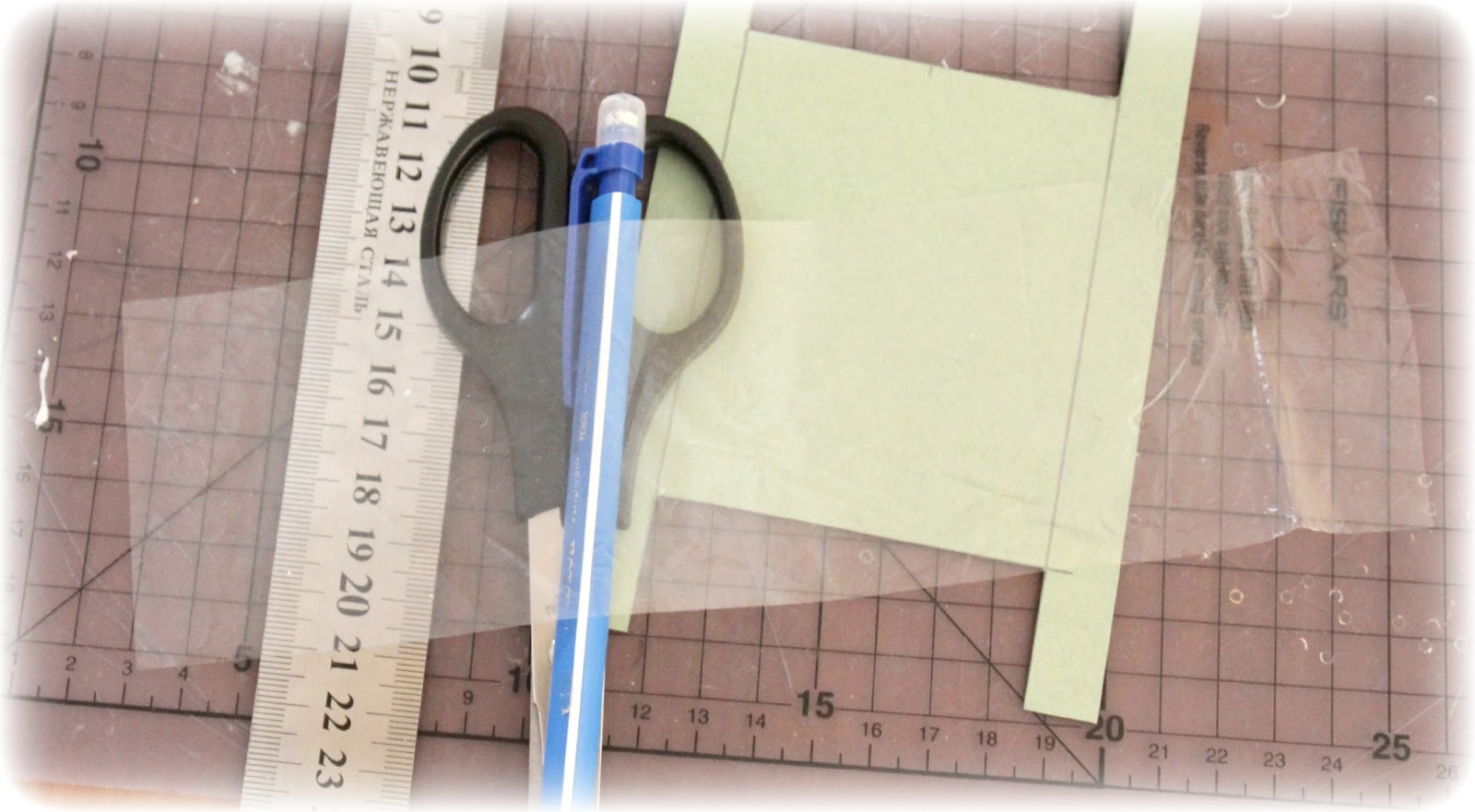 Размеры делала, как на картиночке , но тут самое важное с размерами и экспериментировать, тогда и конструкции будут в голову, как в генератор лезть :)) Берем маленькую деталь и пркладываем ее к левому краю большой - и чертим отметку по краю. Кстати, зеленая деталь - вообще не будет видно, поэтому это может быть любой картон.