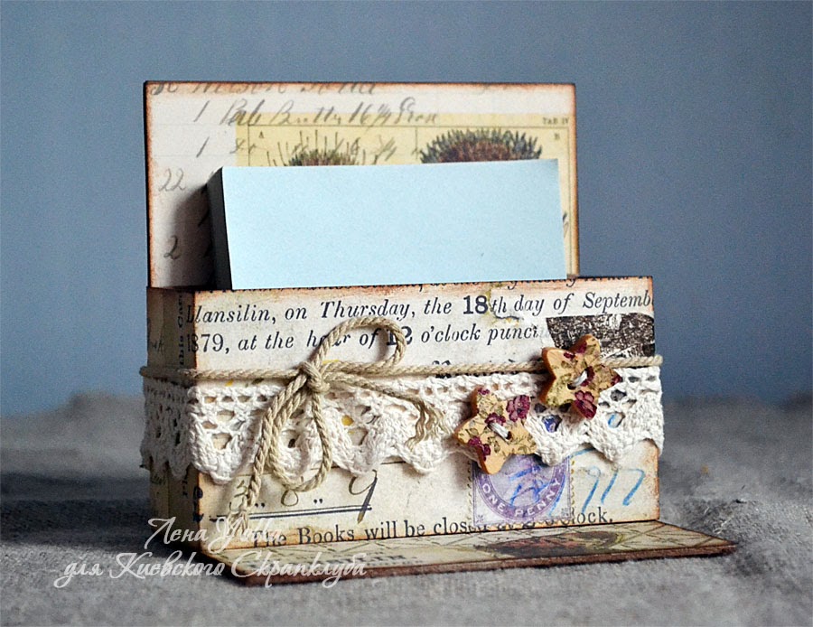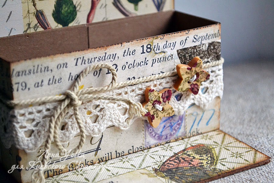 Но я решила все же добавить финальный штрих - кружево, шнур и пуговицы. И в завершение тонировала края подставочки дистресс-чернилами.