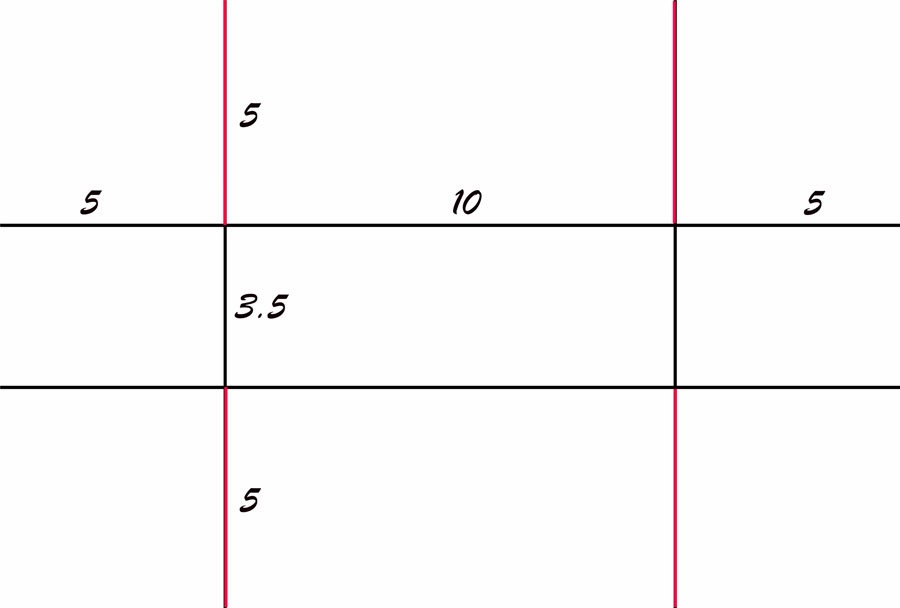 Для основной части подставки я взяла кусок картона размером 13,5х20 см. Сделала линии сгибов и надрезов вот по такой схеме (цифры - длины отрезков в сантиметрах; черные линии - согнуть, красные - разрезать)