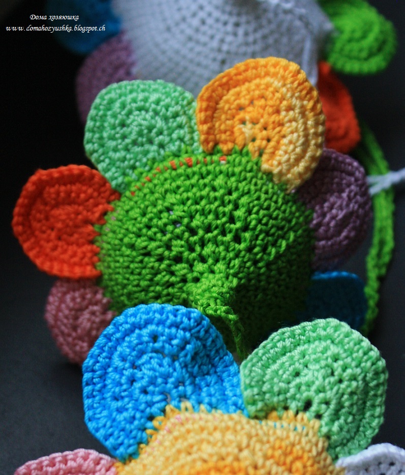 Теперь прикрепляем лепестки. Делаем это полустолбиками, чтобы лепестки торчали в сторны. Вначале расчитаем, сколько петель приходится на каждый лепесток: количество петель в ряду делим на 7 лепестков. Если нацело не разделилось, ничего страшного, просто на некоторые лепестки отведите на 1 петлю больше или меньше, чем на другие.