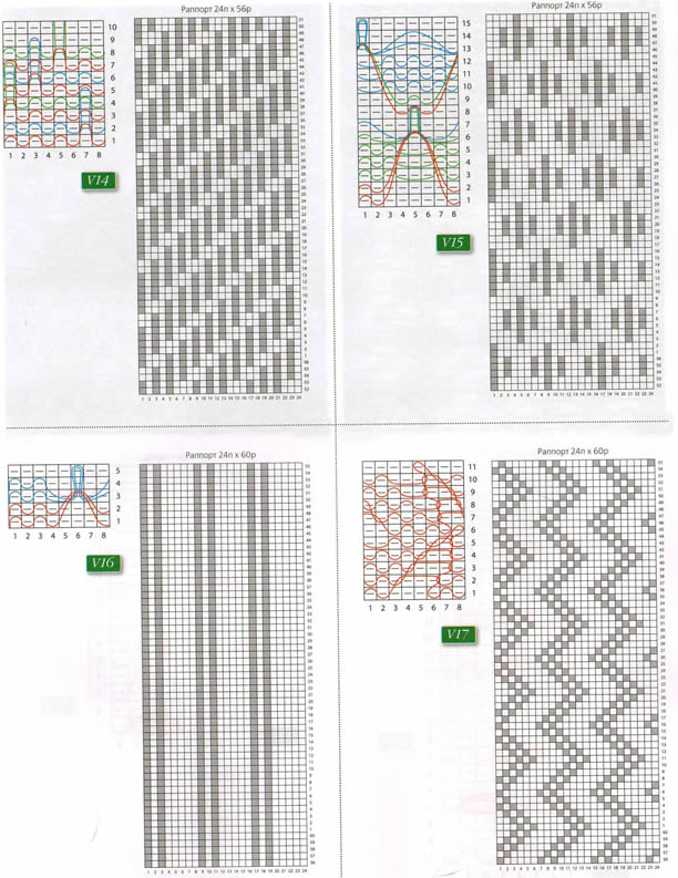 Схемы для стандартного вивинга и вивинга с поднятием протяжек (мережковый) основаны на пикейном поле (чередование петли фона и петли рисунка). Белый квадрат на схеме (неперфорированная часть перфокарты) означает вязание нитью рисунка (вивинговой нитью). Не рекомендуется более 3~4 петель в протяжке. Черный квадрат на схеме (перфорированная часть перфокарты) означает вязание нитью основы (фоновой нитью). Вивинговая нить в данных подвидах подается из верхнего нитенатяжителя и должна быть слабее, чем нить основы, заправленная в отверстие челнока каретки. Для ускорения процесса вязания существует специальное устройство - автовивинг, который может быть использо ван только на вязальных машинах марки Silver Reed 5 класса.