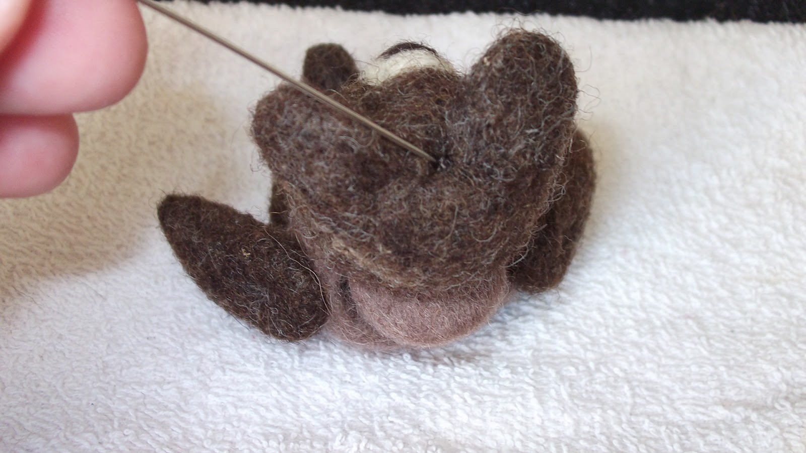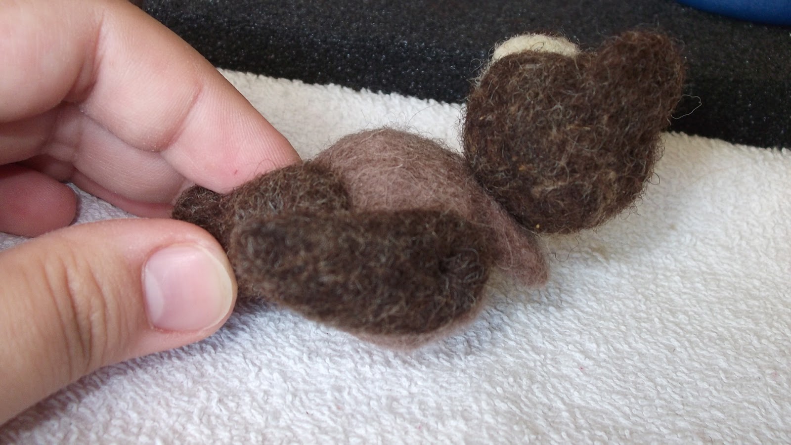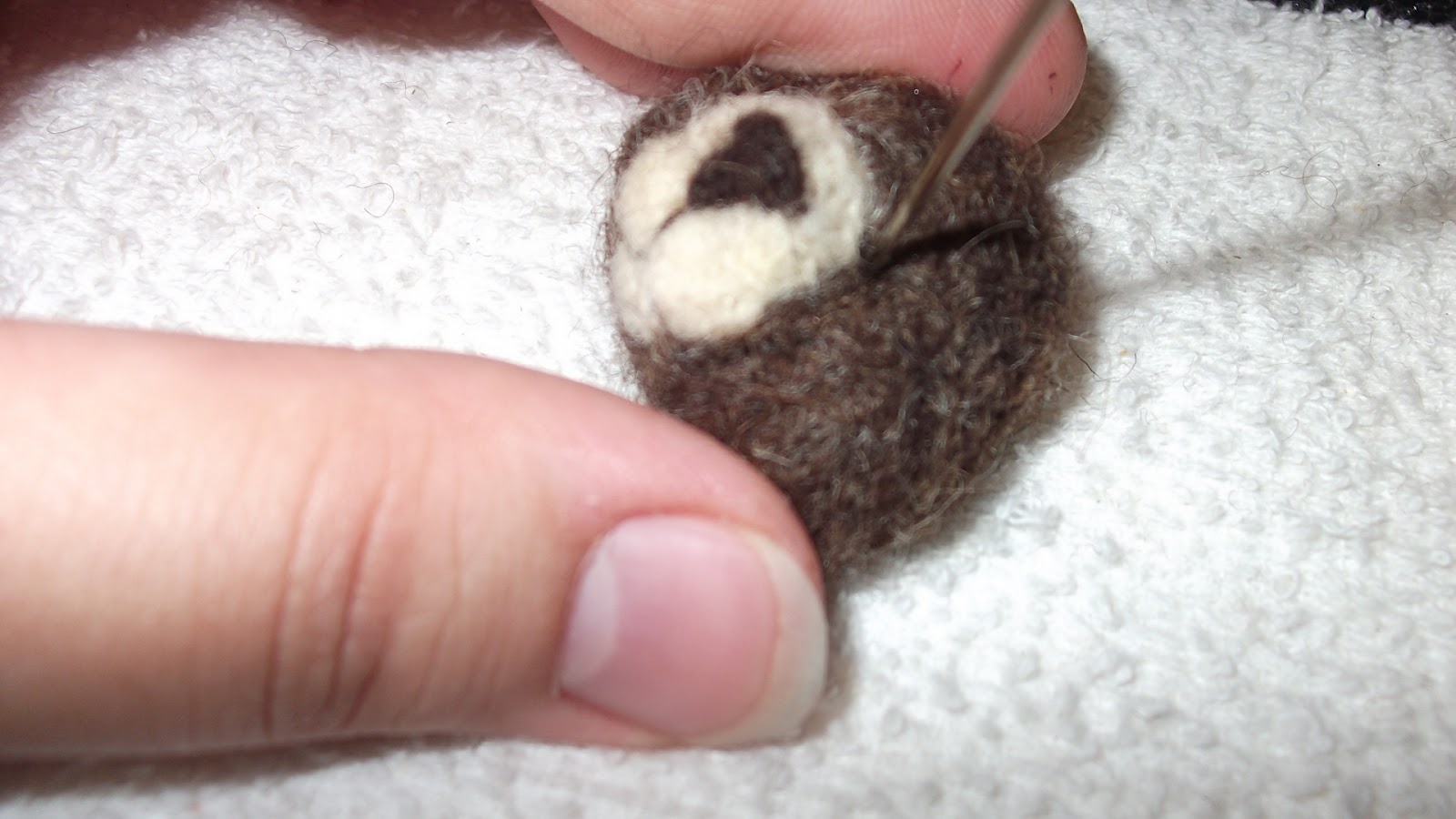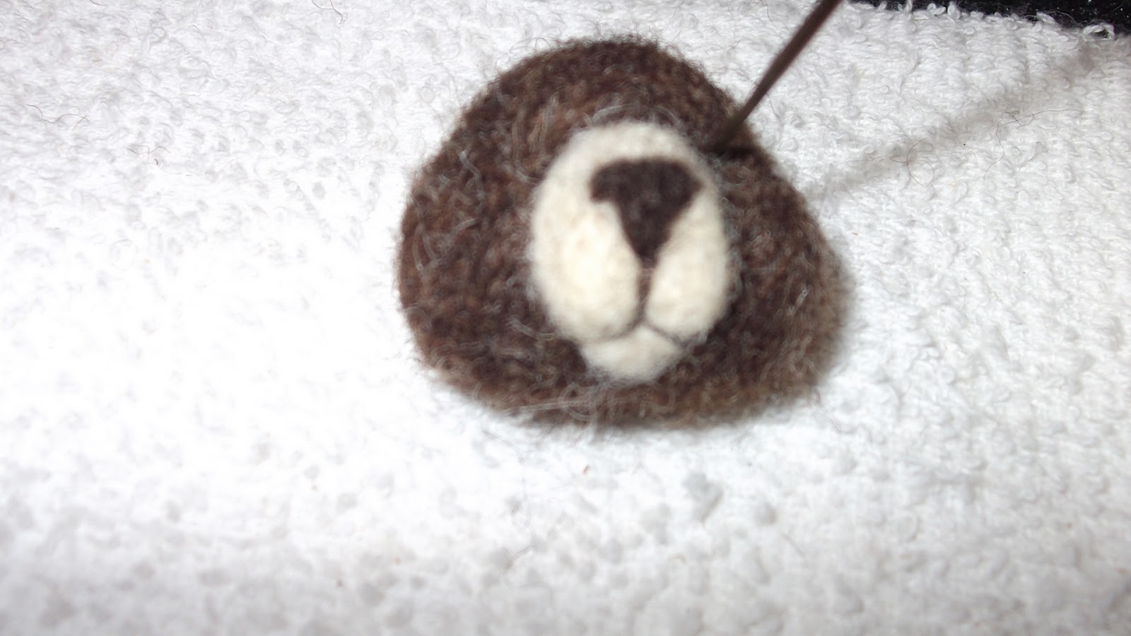 Далее берем маленький комочек коричневого кардочеса и приваливаем на место носика,формируем носик.