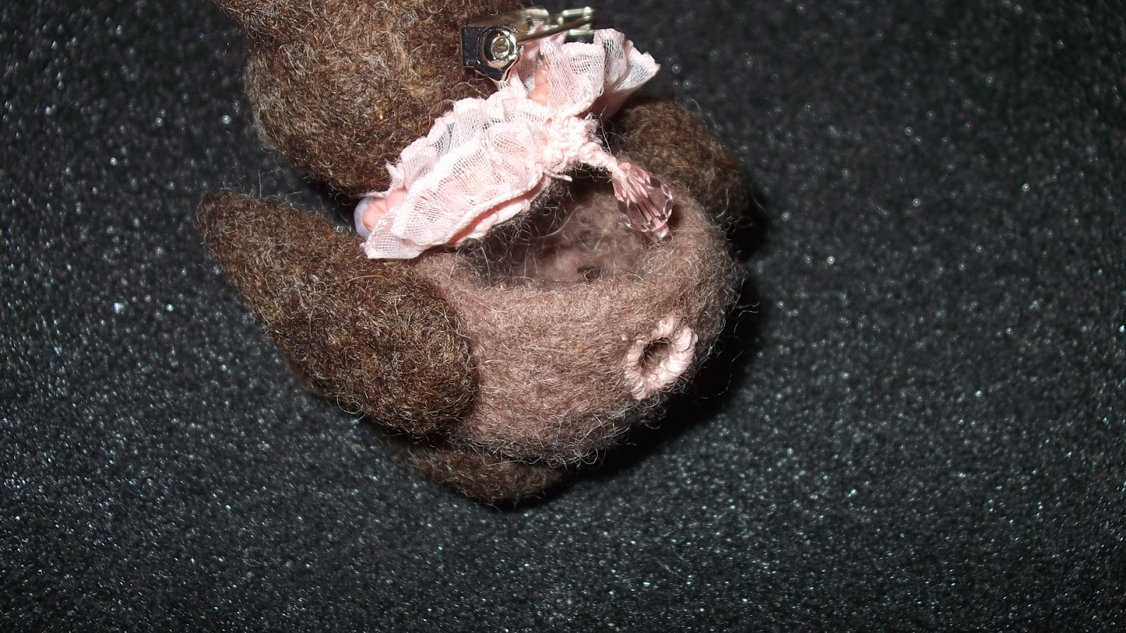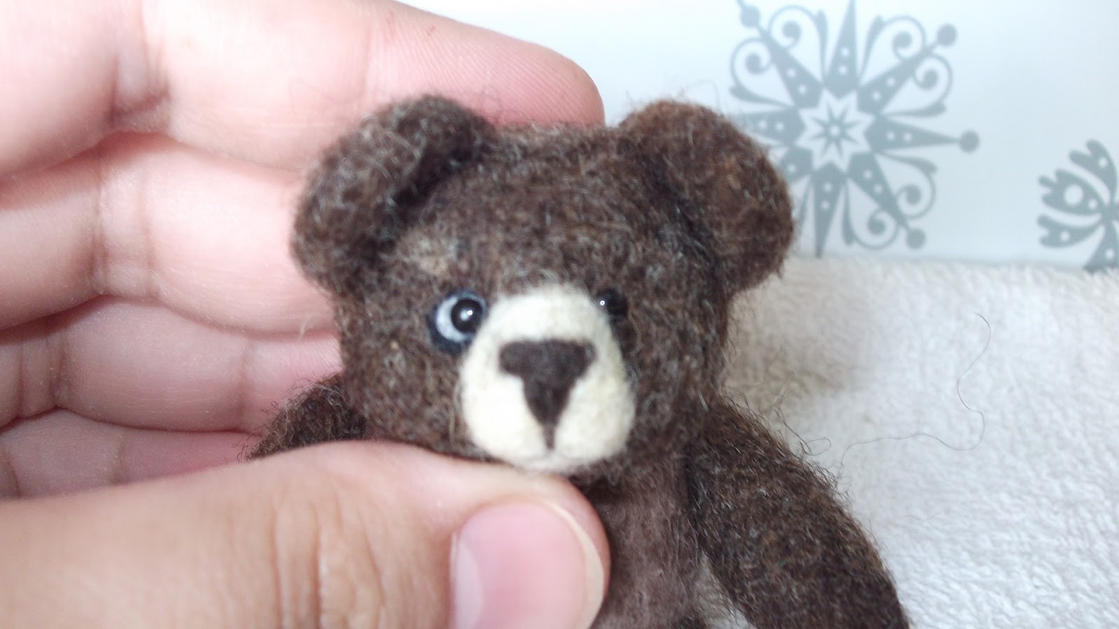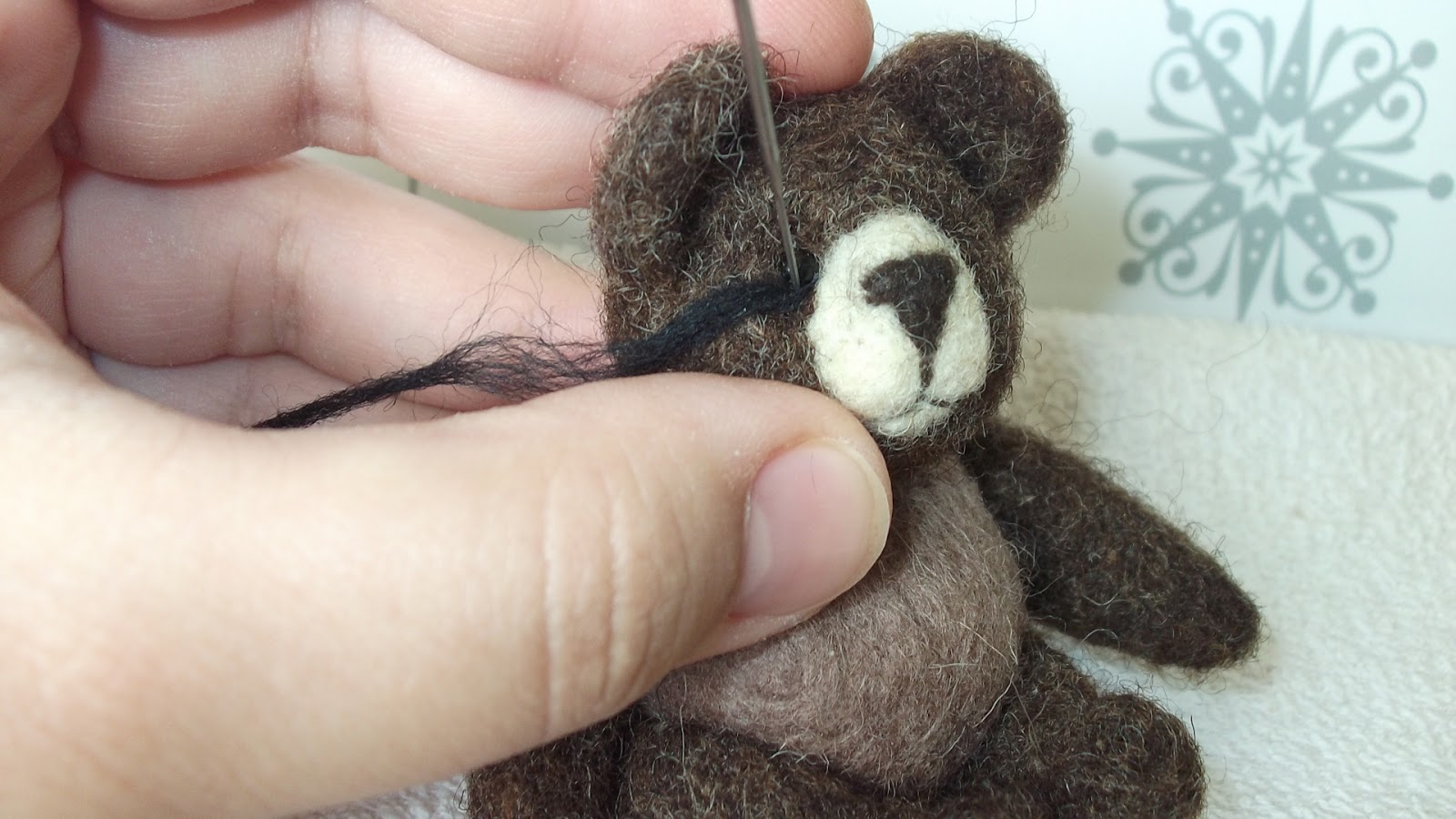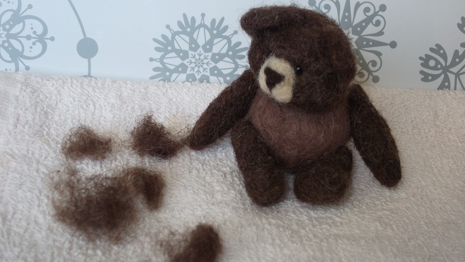 Далее берем маленький комочек коричневого кардочеса и приваливаем на место носика,формируем носик.