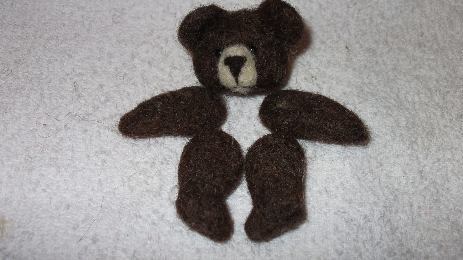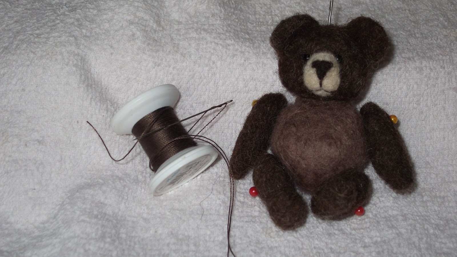 Вот наше тельце и высохло! Теперь начинаем собирать нашу мишко-брошку. Берем голову и лапки, иголочками примеряем,фиксируем на тельце там, где должны быть все конечности относительно тела.
