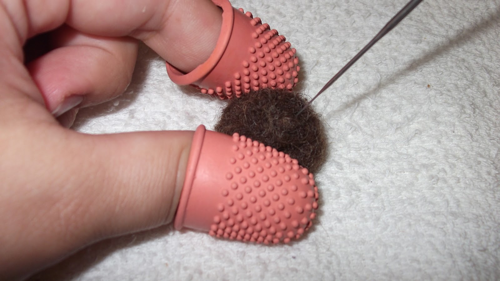 Формируем из него шарик, валяем иголкой в центр шарика. Должен получиться шарик плотный в центре и рыхлый снаружи. При валянии небольших деталей я использую специальные резиновые напальчники, дабы получить наименьшее количество уколов от иглы)))