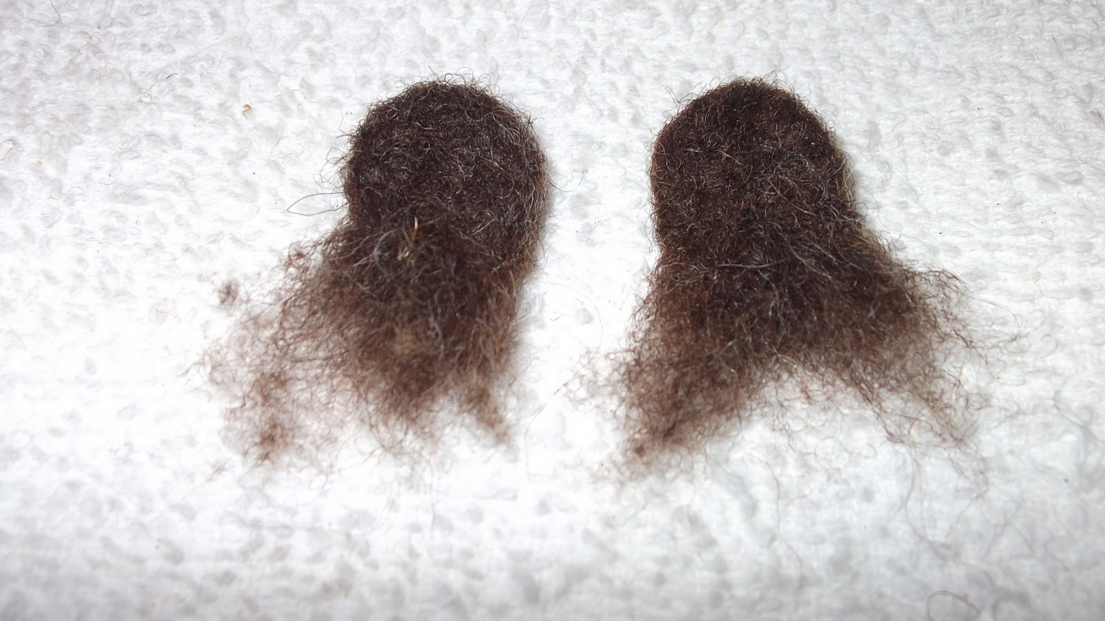 Делаем ушки. Берем два равных комочка кардочеса, валяем два плоских полукруга с одной стороны оставляем не сваленные пушистые хвостики. Определяем более подходящее место для ушек, приваливаем ушки к голове.