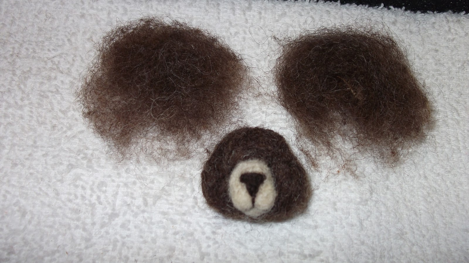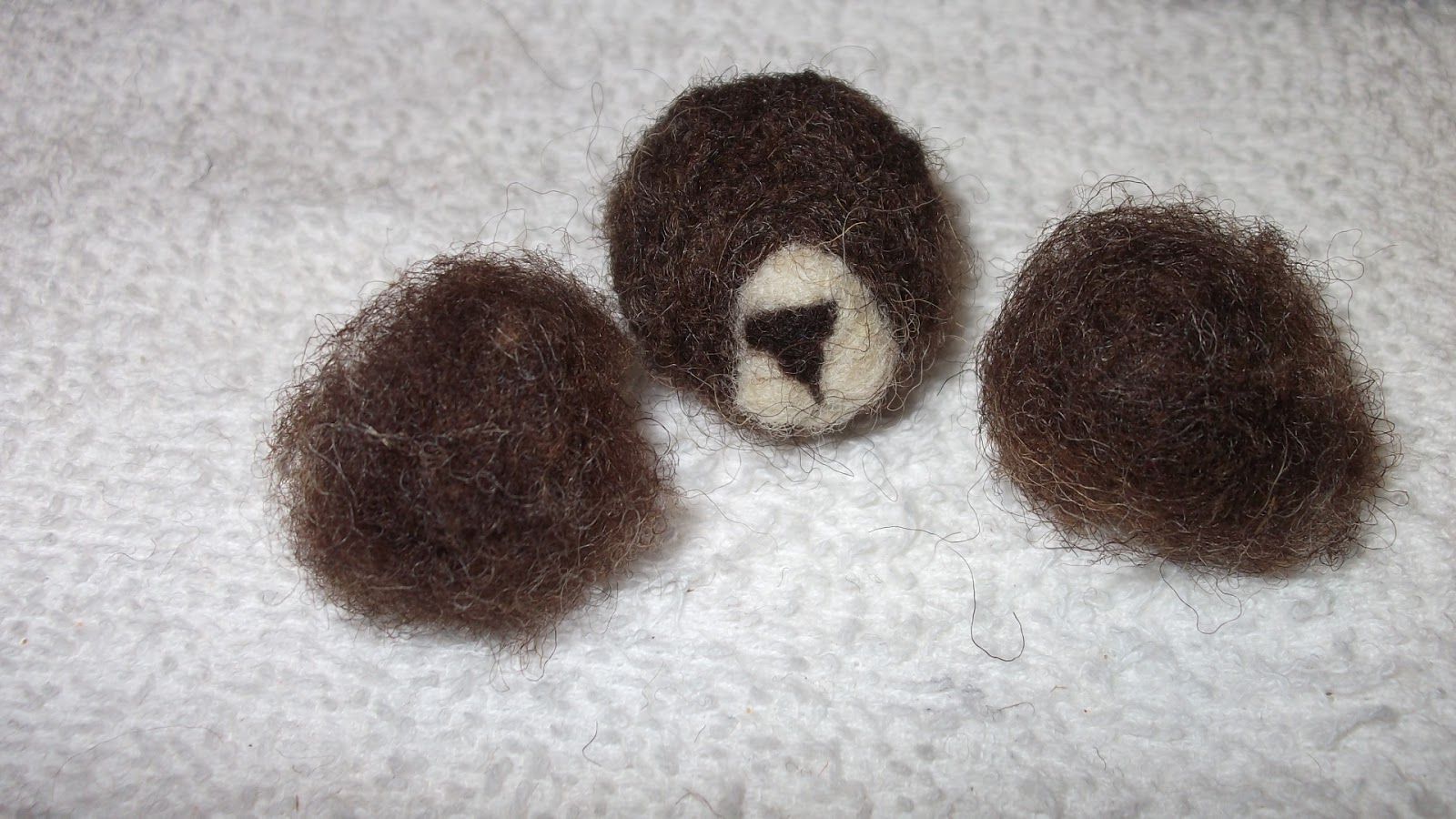Нашему малышу явно не хватает пухлых щечек!) Берем коричневый кардочес формируем два не очень плотных одинаковых шарика, примеряем к голове и приваливаем на место где должны быть щечки.