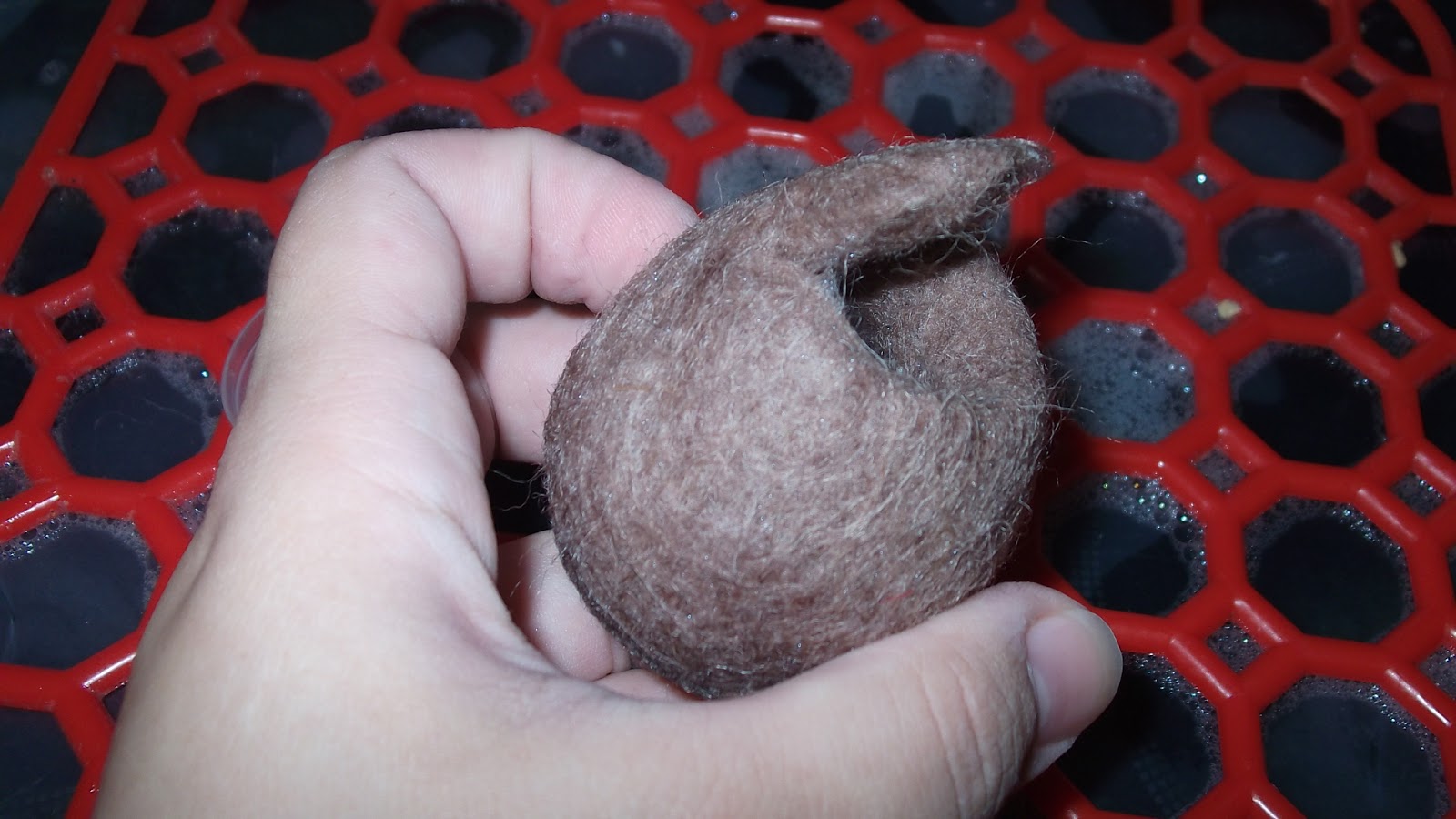 Убираем полиэтилен и мокрыми мыльными руками заворачиваем концы шерсти на кружок (макет).