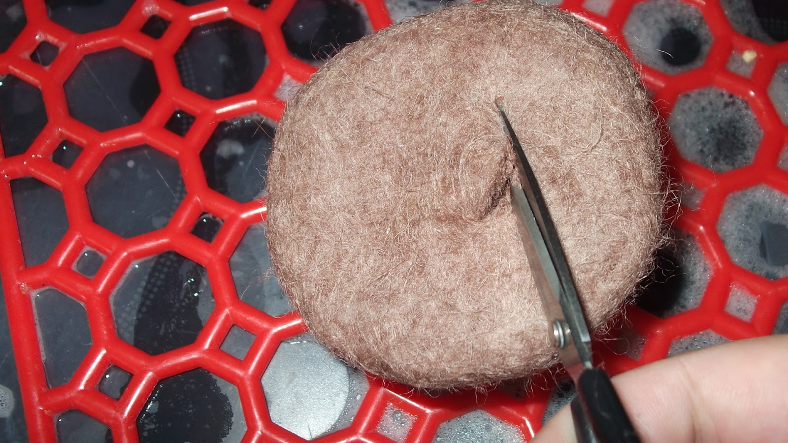 И еще раз повторяем процесс с каждой стороны по пять минут, прилагаем больше усилий. После этого сворачиваем изделие вместе с полиэтиленом в рулон. Покатаем рулон обеими руками по столу 30 раз, после чего развернем рулон, перевернем изделие на 90 градусов по часовой стрелке, опять же сворачиваем в рулон и продолжаем валять еще 30раз. Проделываем это 4 раза. После того как мы проделали одну сторону, переворачиваем изделие и проделываем все то же самое с другой стороной. В процессе валяния постепенно увеличиваем силу давления на изделие. Валяем изделие до тек пор, пока пластмассовый кружок(макет), который находится внутри, не начнет сгибаться. Теперь аккуратно вырезаем отверстие на одной поверхности, будьте осторожны, не прорежьте ваше изделие насквозь.